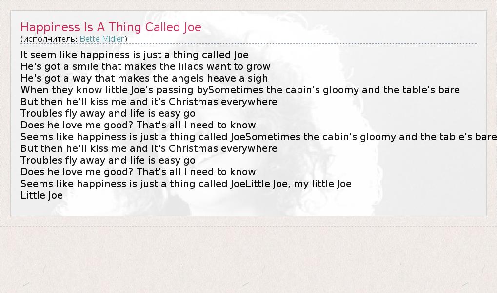 It seem like happiness is just a thing called Joe He's got a smile that makes the lilacs want to grow He's got a way that makes the angels heave a sigh When they know little Joe's passing bySometimes the cabin's gloomy and the table's bare But then he'll kiss me and it's Christmas everywhere Troubles fly away and life is easy go Does he love me good? That's all I need to know Seems like happiness is just a thing called JoeSometimes the cabin's gloomy and the table's bare But then he'll kiss me and it's Christmas everywhere Troubles fly away and life is easy go Does he love me good? That's all I need to know Seems like happiness is just a thing called JoeLittle Joe, my little Joe Little Joe
