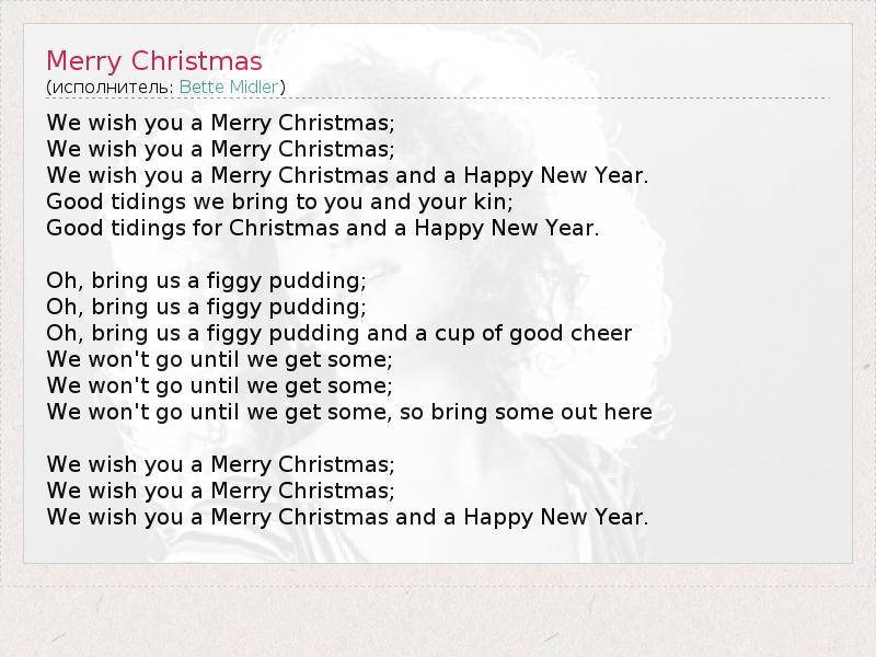 We wish you a Merry Christmas; We wish you a Merry Christmas; We wish you a Merry Christmas and a Happy New Year. Good tidings we bring to you and your kin; Good tidings for Christmas and a Happy New Year. Oh, bring us a figgy pudding; Oh, bring us a figgy pudding; Oh, bring us a figgy pudding and a cup of good cheer We won't go until we get some; We won't go until we get some; We won't go until we get some, so bring some out here We wish you a Merry Christmas; We wish you a Merry Christmas; We wish you a Merry Christmas and a Happy New Year.
