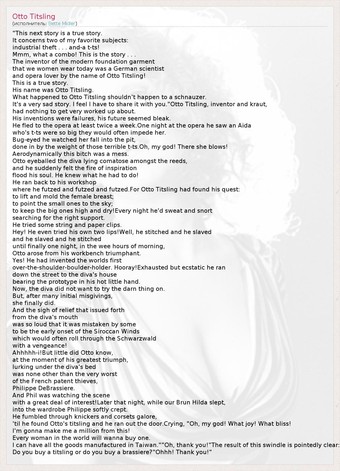 "This next story is a true story. It concerns two of my favorite subjects: industrial theft . . . and-a t-ts! Mmm, what a combo! This is the story . . . The inventor of the modern foundation garment that we women wear today was a German scientist and opera lover by the name of Otto Titsling! This is a true story. His name was Otto Titsling. What happened to Otto Titsling shouldn't happen to a schnauzer. It's a very sad story. I feel I have to share it with you."Otto Titsling, inventor and kraut, had nothing to get very worked up about. His inventions were failures, his future seemed bleak. He fled to the opera at least twice a week.One night at the opera he saw an Aida who's t-ts were so big they would often impede her. Bug-eyed he watched her fall into the pit, done in by the weight of those terrible t-ts.Oh, my god! There she blows! Aerodynamically this bitch was a mess. Otto eyeballed the diva lying comatose amongst the reeds, and he suddenly felt the fire of inspiration flood his soul. He knew what he had to do! He ran back to his workshop where he futzed and futzed and futzed.For Otto Titsling had found his quest: to lift and mold the female breast; to point the small ones to the sky; to keep the big ones high and dry!Every night he'd sweat and snort searching for the right support. He tried some string and paper clips. Hey! He even tried his own two lips!Well, he stitched and he slaved and he slaved and he stitched until finally one night, in the wee hours of morning, Otto arose from his workbench triumphant. Yes! He had invented the worlds first over-the-shoulder-boulder-holder. Hooray!Exhausted but ecstatic he ran down the street to the diva's house bearing the prototype in his hot little hand. Now, the diva did not want to try the darn thing on. But, after many initial misgivings, she finally did. And the sigh of relief that issued forth from the diva's mouth was so loud that it was mistaken by some to be the early onset of the Siroccan Winds which would often roll through the Schwarzwald with a vengeance! Ahhhhh-i!But little did Otto know, at the moment of his greatest triumph, lurking under the diva's bed was none other than the very worst of the French patent thieves, Philippe DeBrassiere. And Phil was watching the scene with a great deal of interest!Later that night, while our Brun Hilda slept, into the wardrobe Philippe softly crept. He fumbled through knickers and corsets galore, 'til he found Otto's titsling and he ran out the door.Crying, "Oh, my god! What joy! What bliss! I'm gonna make me a million from this! Every woman in the world will wanna buy one. I can have all the goods manufactured in Taiwan.""Oh, thank you!"The result of this swindle is pointedly clear: Do you buy a titsling or do you buy a brassiere?"Ohhh! Thank you!"