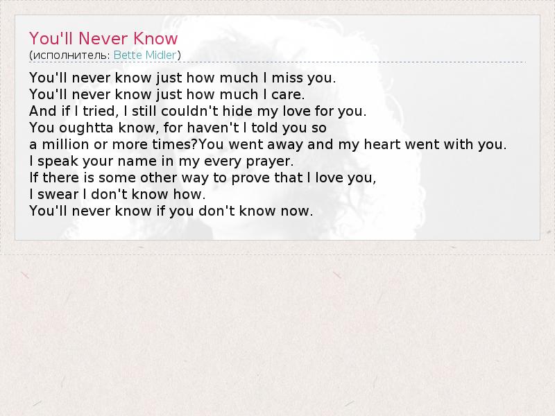 You'll never know just how much I miss you. You'll never know just how much I care. And if I tried, I still couldn't hide my love for you. You oughtta know, for haven't I told you so a million or more times?You went away and my heart went with you. I speak your name in my every prayer. If there is some other way to prove that I love you, I swear I don't know how. You'll never know if you don't know now.