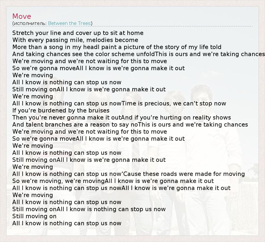 Stretch your line and cover up to sit at home With every passing mile, melodies become More than a song in my headI paint a picture of the story of my life told And taking chances see the color scheme unfoldThis is ours and we're taking chances We're moving and we're not waiting for this to move So we're gonna moveAll I know is we're gonna make it out We're moving All I know is nothing can stop us now Still moving onAll I know is we're gonna make it out We're moving All I know is nothing can stop us nowTime is precious, we can't stop now If you're burdened by the bruises Then you're never gonna make it outAnd if you're hurting on reality shows And talent branches are a reason to say noThis is ours and we're taking chances We're moving and we're not waiting for this to move So we're gonna moveAll I know is we're gonna make it out We're moving All I know is nothing can stop us now Still moving onAll I know is we're gonna make it out We're moving All I know is nothing can stop us now'Cause these roads were made for moving So we're moving, we're movingAll I know is we're gonna make it out All I know is nothing can stop us nowAll I know is we're gonna make it out We're moving All I know is nothing can stop us now Still moving onAll I know is nothing can stop us now Still moving on All I know is nothing can stop us now