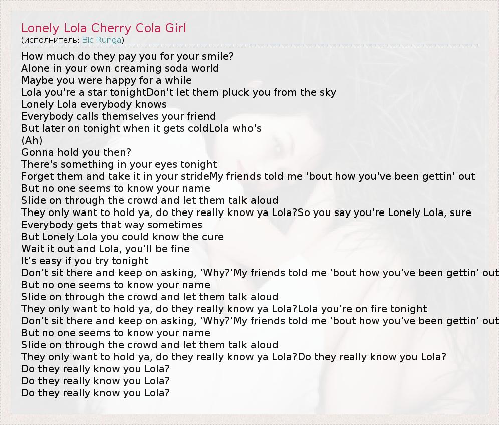 А как ты думаешь, о чем песня "Lonely Lola Cherry Cola Girl" ?