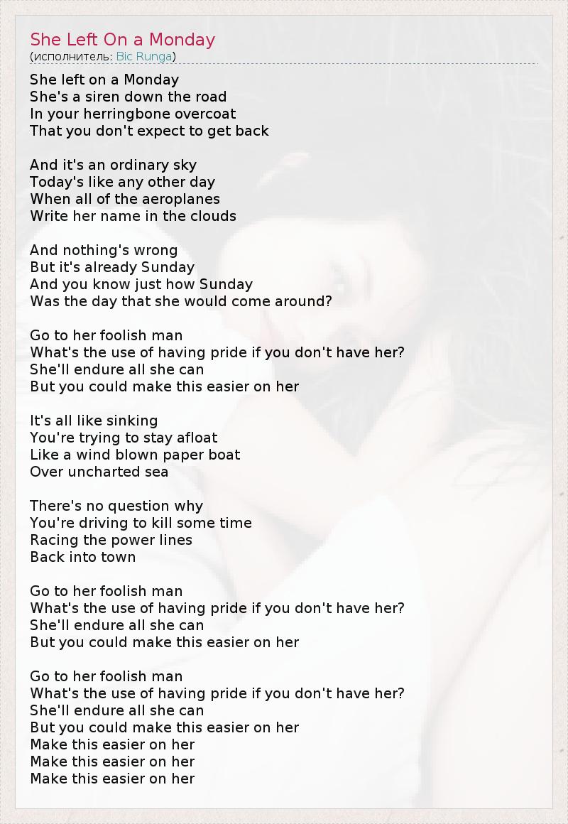 А как ты думаешь, о чем песня "She Left On a Monday" ?