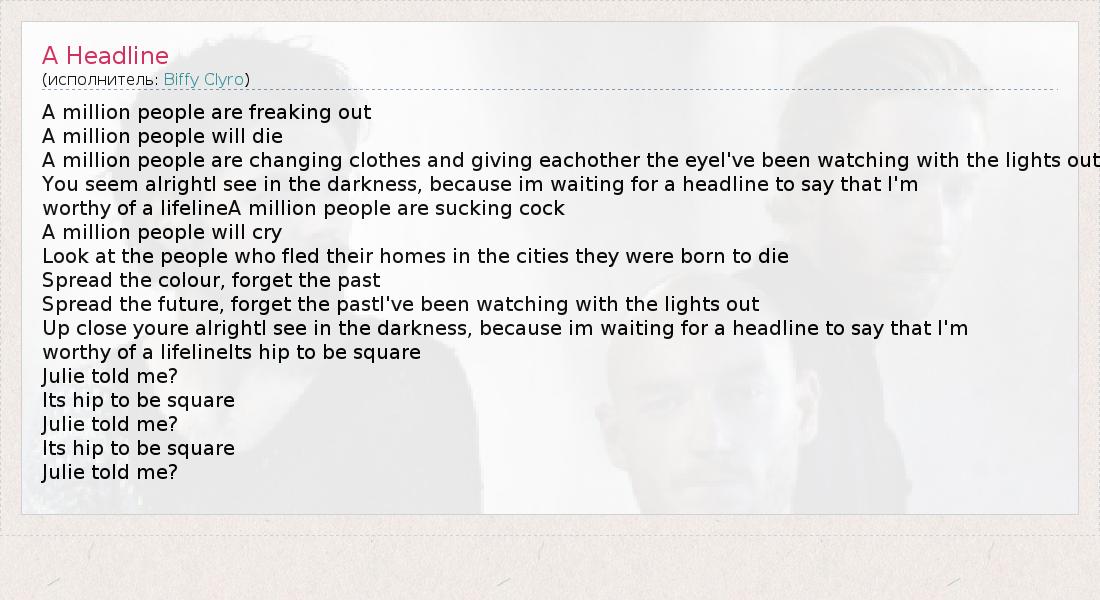 Это интересно:В 1995 году, который можно считать годом рождения Biffy Clyro, будущий вокалист, гитарист и композитор Саймон Нил, 15 лет от роду, еще учился в общеобразовательной школе в шотландском городке Эре. Хотя с пяти лет он играл на скрипке, его призванием стала не классика, а рок-музыка: наслушавшись Nirvana, Weezer и Pearl Jam, он всерьез взялся за гитару в начале 95 года решил, что пора становиться настоящим фронтменом... продолжение