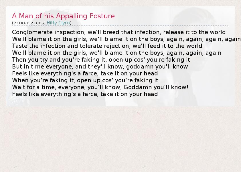 Conglomerate inspection, we'll breed that infection, release it to the world We'll blame it on the girls, we'll blame it on the boys, again, again, again, again Taste the infection and tolerate rejection, we'll feed it to the world We'll blame it on the girls, we'll blame it on the boys, again, again, again Then you try and you're faking it, open up cos' you're faking it But in time everyone, and they'll know, goddamn you'll know Feels like everything's a farce, take it on your head When you're faking it, open up cos' you're faking it Wait for a time, everyone, you'll know, Goddamn you'll know! Feels like everything's a farce, take it on your head
