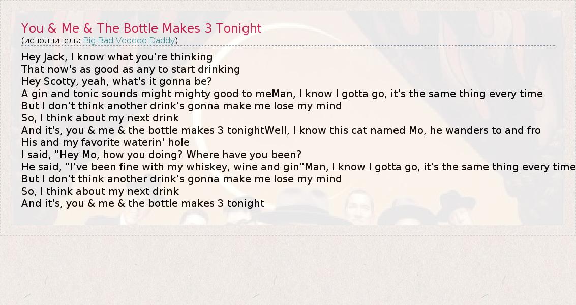 Hey Jack, I know what you're thinking That now's as good as any to start drinking Hey Scotty, yeah, what's it gonna be? A gin and tonic sounds might mighty good to meMan, I know I gotta go, it's the same thing every time But I don't think another drink's gonna make me lose my mind So, I think about my next drink And it's, you & me & the bottle makes 3 tonightWell, I know this cat named Mo, he wanders to and fro His and my favorite waterin' hole I said, "Hey Mo, how you doing? Where have you been? He said, "I've been fine with my whiskey, wine and gin"Man, I know I gotta go, it's the same thing every time But I don't think another drink's gonna make me lose my mind So, I think about my next drink And it's, you & me & the bottle makes 3 tonight