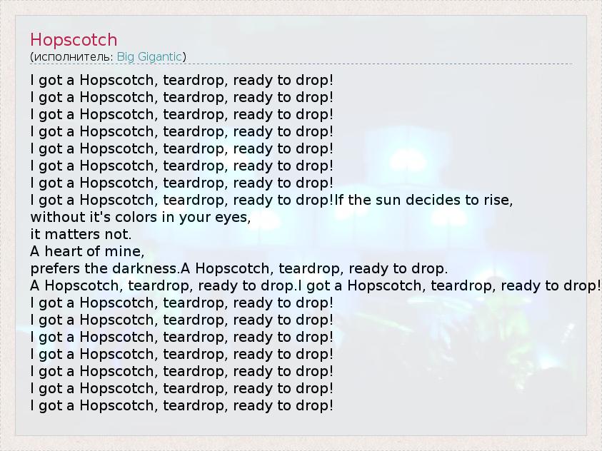 А как ты думаешь, о чем песня "Hopscotch" ?