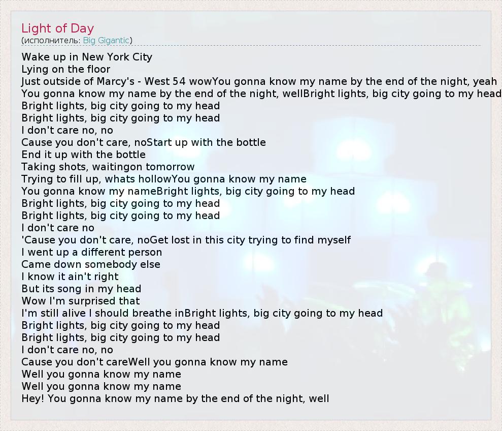 Wake up in New York City Lying on the floor Just outside of Marcy's - West 54 wowYou gonna know my name by the end of the night, yeah You gonna know my name by the end of the night, wellBright lights, big city going to my head Bright lights, big city going to my head Bright lights, big city going to my head I don't care no, no Cause you don't care, noStart up with the bottle End it up with the bottle Taking shots, waitingon tomorrow Trying to fill up, whats hollowYou gonna know my name You gonna know my nameBright lights, big city going to my head Bright lights, big city going to my head Bright lights, big city going to my head I don't care no 'Cause you don't care, noGet lost in this city trying to find myself I went up a different person Came down somebody else I know it ain't right But its song in my head Wow I'm surprised that I'm still alive I should breathe inBright lights, big city going to my head Bright lights, big city going to my head Bright lights, big city going to my head I don't care no, no Cause you don't careWell you gonna know my name Well you gonna know my name Well you gonna know my name Hey! You gonna know my name by the end of the night, well