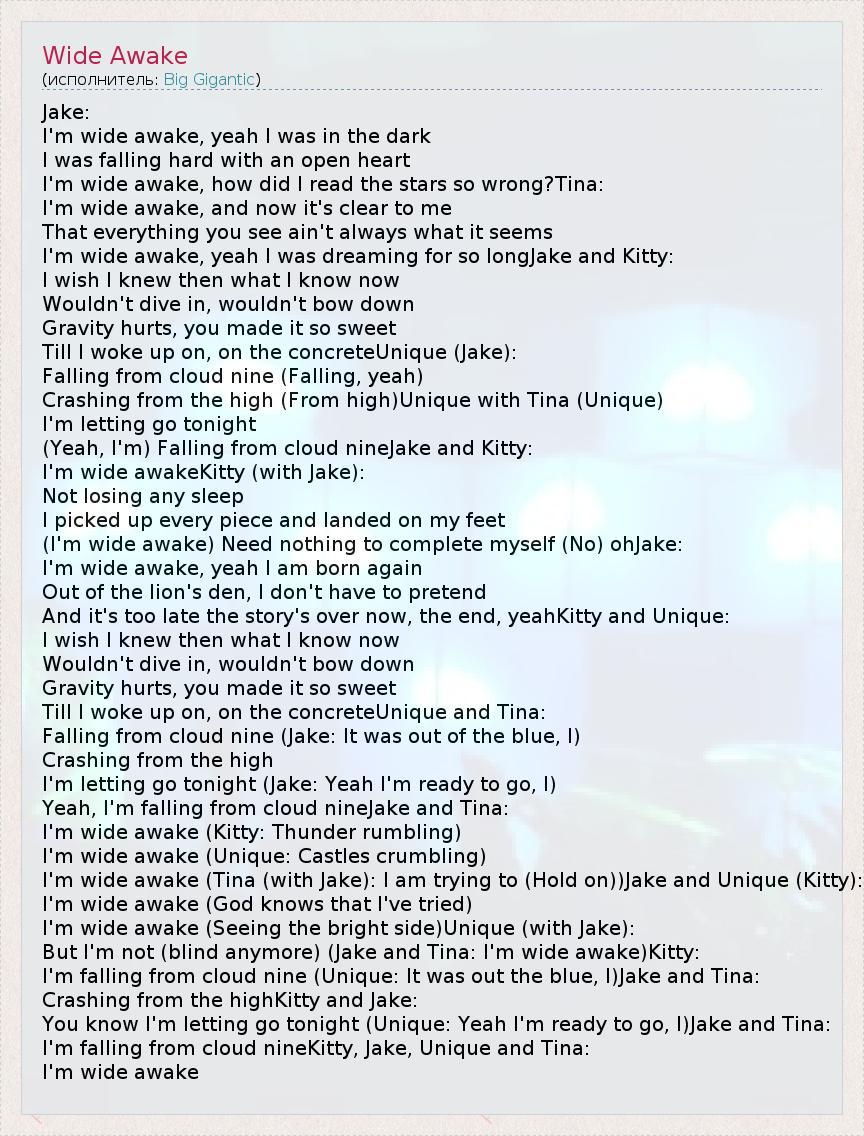 Jake: I'm wide awake, yeah I was in the dark I was falling hard with an open heart I'm wide awake, how did I read the stars so wrong?Tina: I'm wide awake, and now it's clear to me That everything you see ain't always what it seems I'm wide awake, yeah I was dreaming for so longJake and Kitty: I wish I knew then what I know now Wouldn't dive in, wouldn't bow down Gravity hurts, you made it so sweet Till I woke up on, on the concreteUnique (Jake): Falling from cloud nine (Falling, yeah) Crashing from the high (From high)Unique with Tina (Unique) I'm letting go tonight (Yeah, I'm) Falling from cloud nineJake and Kitty: I'm wide awakeKitty (with Jake): Not losing any sleep I picked up every piece and landed on my feet (I'm wide awake) Need nothing to complete myself (No) ohJake: I'm wide awake, yeah I am born again Out of the lion's den, I don't have to pretend And it's too late the story's over now, the end, yeahKitty and Unique: I wish I knew then what I know now Wouldn't dive in, wouldn't bow down Gravity hurts, you made it so sweet Till I woke up on, on the concreteUnique and Tina: Falling from cloud nine (Jake: It was out of the blue, I) Crashing from the high I'm letting go tonight (Jake: Yeah I'm ready to go, I) Yeah, I'm falling from cloud nineJake and Tina: I'm wide awake (Kitty: Thunder rumbling) I'm wide awake (Unique: Castles crumbling) I'm wide awake (Tina (with Jake): I am trying to (Hold on))Jake and Unique (Kitty): I'm wide awake (God knows that I've tried) I'm wide awake (Seeing the bright side)Unique (with Jake): But I'm not (blind anymore) (Jake and Tina: I'm wide awake)Kitty: I'm falling from cloud nine (Unique: It was out the blue, I)Jake and Tina: Crashing from the highKitty and Jake: You know I'm letting go tonight (Unique: Yeah I'm ready to go, I)Jake and Tina: I'm falling from cloud nineKitty, Jake, Unique and Tina: I'm wide awake