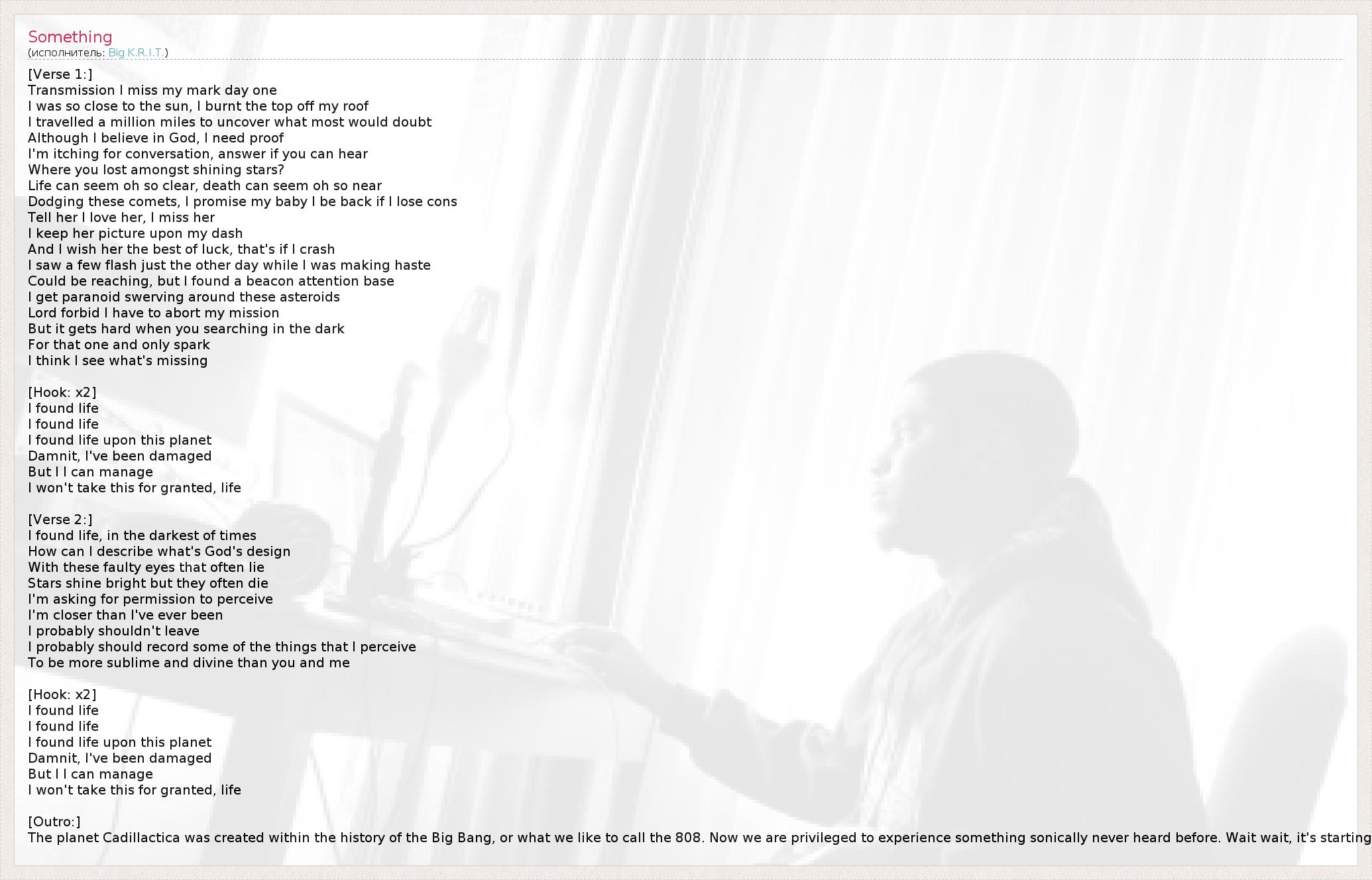 Это интересно:Justin Scott (родился 26 августа 1986 г.), более известный под псевдонимом Big K.R.I.T. - американский рэпер и продюссер из Меридиэна, Миссисипи.В июне 2010 г. Big K.R.I.T. выпустил альбом "K.R.I.T. Wuz Here", который получил положительные отзывы. В том же месяце бывший президент G-Unit Records и нынешний старший вице-президент по артистам и репертуару Def Jam Recordings Sha Money XL подписал с ним контракт как с одним из его главных... продолжение