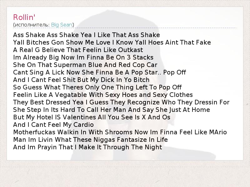 Ass Shake Ass Shake Yea I Like That Ass Shake Yall Bitches Gon Show Me Love I Know Yall Hoes Aint That Fake A Real G Believe That Feelin Like Outkast Im Already Big Now Im Finna Be On 3 Stacks She On That Superman Blue And Red Cop Car Cant Sing A Lick Now She Finna Be A Pop Star.. Pop Off And I Cant Feel Shit But My Dick In Yo Bitch So Guess What Theres Only One Thing Left To Pop Off Feelin Like A Vegatable With Sexy Hoes and Sexy Clothes They Best Dressed Yea I Guess They Recognize Who They Dressin For She Step In Its Hard To Call Her Man And Say She Just At Home But My Hotel IS Valentines All You See Is X And Os And I Cant Feel My Cardio Motherfuckas Walkin In With Shrooms Now Im Finna Feel Like MArio Man Im Livin What These Niggas Fantasize In Life And Im Prayin That I Make It Through The Night