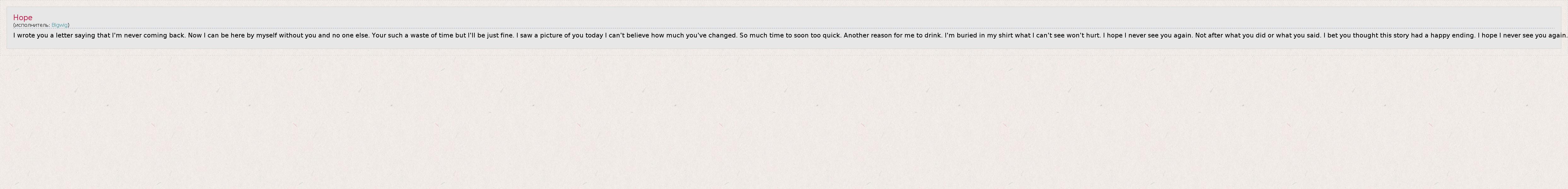I wrote you a letter saying that I'm never coming back. Now I can be here by myself without you and no one else. Your such a waste of time but I'll be just fine. I saw a picture of you today I can't believe how much you've changed. So much time to soon too quick. Another reason for me to drink. I'm buried in my shirt what I can't see won't hurt. I hope I never see you again. Not after what you did or what you said. I bet you thought this story had a happy ending. I hope I never see you again.