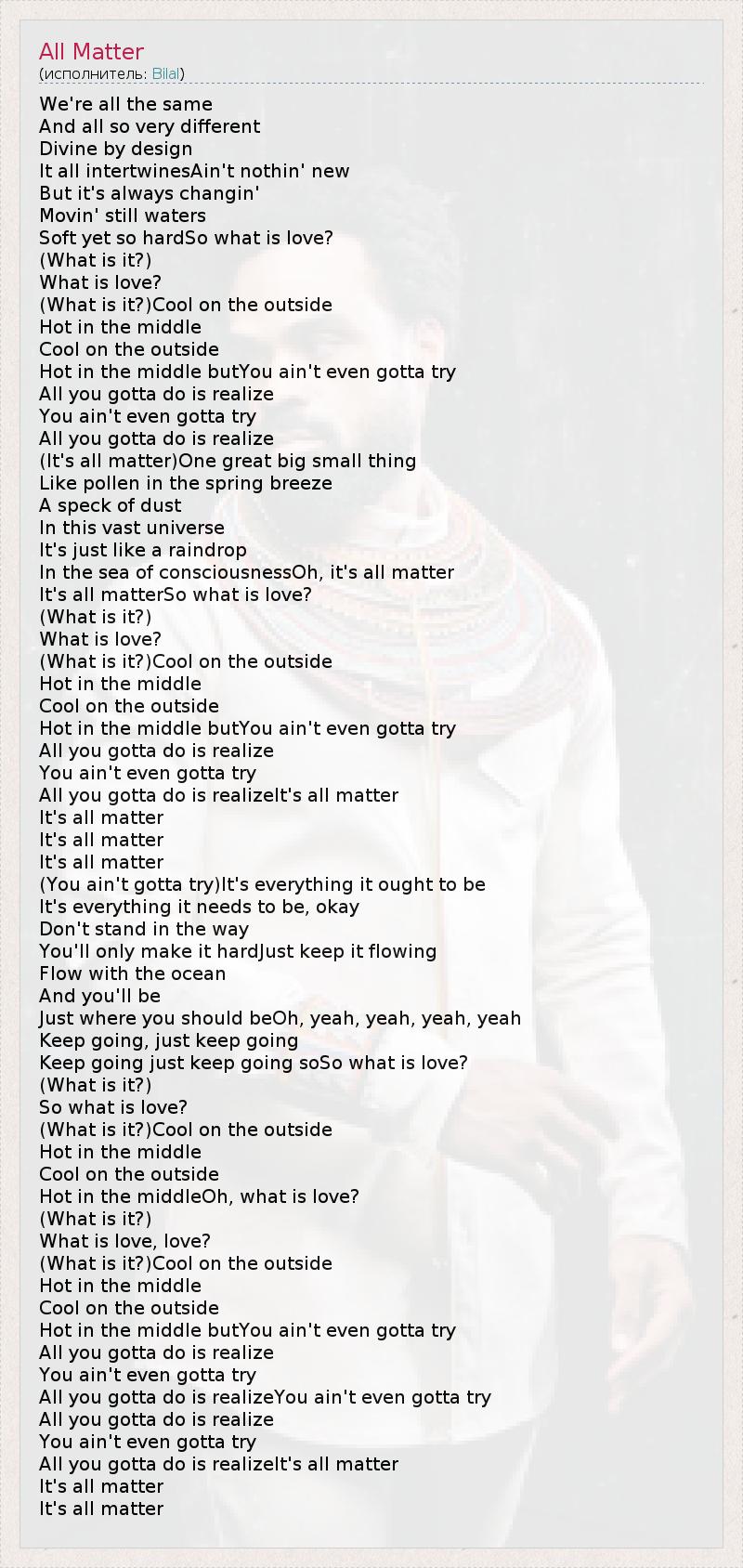 We're all the same And all so very different Divine by design It all intertwinesAin't nothin' new But it's always changin' Movin' still waters Soft yet so hardSo what is love? (What is it?) What is love? (What is it?)Cool on the outside Hot in the middle Cool on the outside Hot in the middle butYou ain't even gotta try All you gotta do is realize You ain't even gotta try All you gotta do is realize (It's all matter)One great big small thing Like pollen in the spring breeze A speck of dust In this vast universe It's just like a raindrop In the sea of consciousnessOh, it's all matter It's all matterSo what is love? (What is it?) What is love? (What is it?)Cool on the outside Hot in the middle Cool on the outside Hot in the middle butYou ain't even gotta try All you gotta do is realize You ain't even gotta try All you gotta do is realizeIt's all matter It's all matter It's all matter It's all matter (You ain't gotta try)It's everything it ought to be It's everything it needs to be, okay Don't stand in the way You'll only make it hardJust keep it flowing Flow with the ocean And you'll be Just where you should beOh, yeah, yeah, yeah, yeah Keep going, just keep going Keep going just keep going soSo what is love? (What is it?) So what is love? (What is it?)Cool on the outside Hot in the middle Cool on the outside Hot in the middleOh, what is love? (What is it?) What is love, love? (What is it?)Cool on the outside Hot in the middle Cool on the outside Hot in the middle butYou ain't even gotta try All you gotta do is realize You ain't even gotta try All you gotta do is realizeYou ain't even gotta try All you gotta do is realize You ain't even gotta try All you gotta do is realizeIt's all matter It's all matter It's all matter