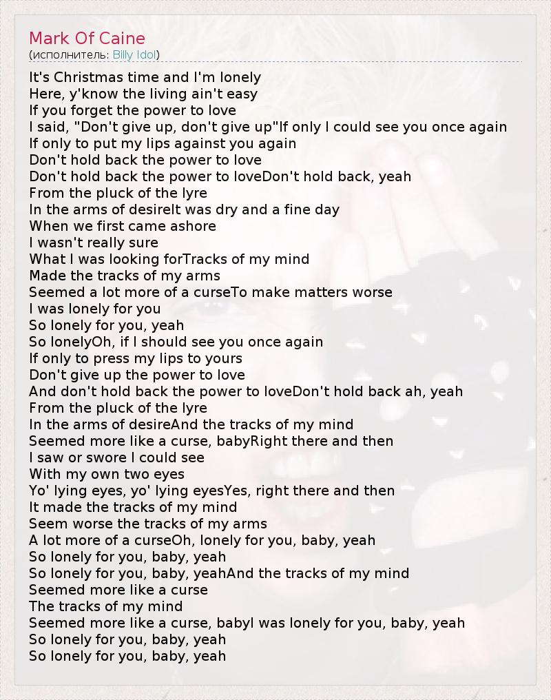 It's Christmas time and I'm lonely Here, y'know the living ain't easy If you forget the power to love I said, "Don't give up, don't give up"If only I could see you once again If only to put my lips against you again Don't hold back the power to love Don't hold back the power to loveDon't hold back, yeah From the pluck of the lyre In the arms of desireIt was dry and a fine day When we first came ashore I wasn't really sure What I was looking forTracks of my mind Made the tracks of my arms Seemed a lot more of a curseTo make matters worse I was lonely for you So lonely for you, yeah So lonelyOh, if I should see you once again If only to press my lips to yours Don't give up the power to love And don't hold back the power to loveDon't hold back ah, yeah From the pluck of the lyre In the arms of desireAnd the tracks of my mind Seemed more like a curse, babyRight there and then I saw or swore I could see With my own two eyes Yo' lying eyes, yo' lying eyesYes, right there and then It made the tracks of my mind Seem worse the tracks of my arms A lot more of a curseOh, lonely for you, baby, yeah So lonely for you, baby, yeah So lonely for you, baby, yeahAnd the tracks of my mind Seemed more like a curse The tracks of my mind Seemed more like a curse, babyI was lonely for you, baby, yeah So lonely for you, baby, yeah So lonely for you, baby, yeah