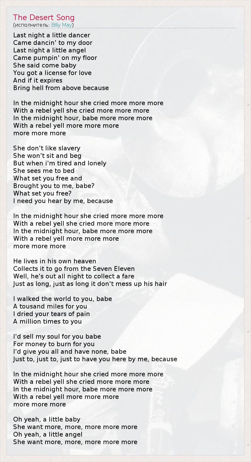 Last night a little dancer Came dancin' to my door Last night a little angel Came pumpin' on my floor She said come baby You got a license for love And if it expires Bring hell from above because In the midnight hour she cried more more more With a rebel yell she cried more more more In the midnight hour, babe more more more With a rebel yell more more more more more more She don't like slavery She won't sit and beg But when i'm tired and lonely She sees me to bed What set you free and Brought you to me, babe? What set you free? I need you hear by me, because In the midnight hour she cried more more more With a rebel yell she cried more more more In the midnight hour, babe more more more With a rebel yell more more more more more more He lives in his own heaven Collects it to go from the Seven Eleven Well, he's out all night to collect a fare Just as long, just as long it don't mess up his hair I walked the world to you, babe A tousand miles for you I dried your tears of pain A million times to you I'd sell my soul for you babe For money to burn for you I'd give you all and have none, babe Just to, just to, just to have you here by me, because In the midnight hour she cried more more more With a rebel yell she cried more more more In the midnight hour, babe more more more With a rebel yell more more more more more more Oh yeah, a little baby She want more, more, more more more Oh yeah, a little angel She want more, more, more more more