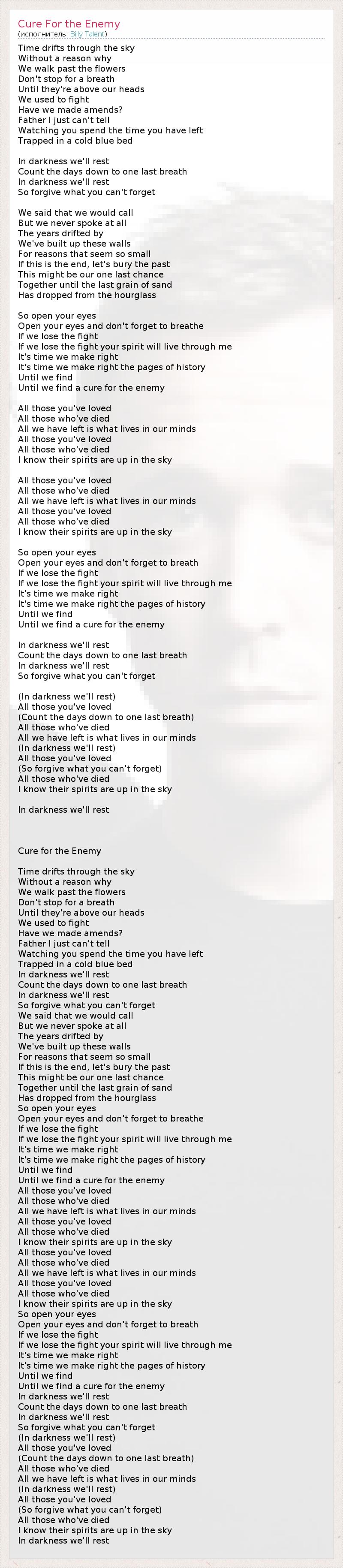 А как ты думаешь, о чем песня "Cure For the Enemy" ?