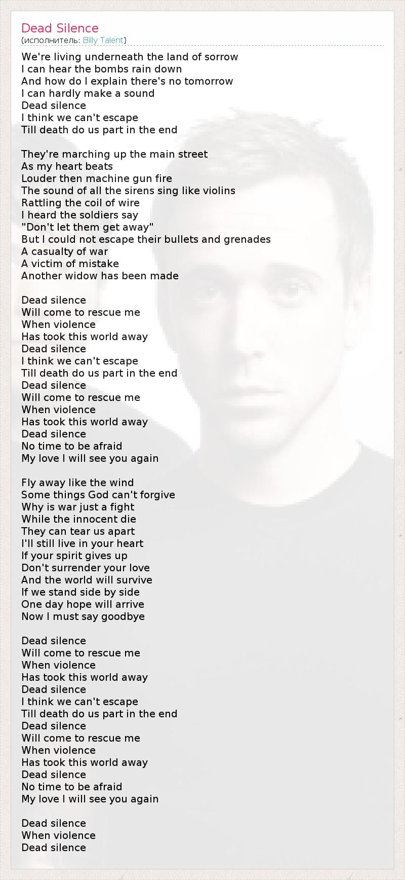 Мы живем под землей горя, Я слышу дождь из бомб, И как мне объяснить, что завтра не будет? Я едва могу говорить, Мертвая тишина. Я думаю, что мы не сможем убежать, Пока смерть не разлучит нас Они идут по главной улице, А удары моего сердца Громче, чем огонь автомата. Сирены поют, как скрипки, Грохочут провода. Я слышал, что солдаты сказали: "Не дайте им уйти" Но я не смог избежать их пуль и гранат, Жертва войны, Жертва ошибки, Одной вдовой теперь больше Мертвая тишина Придет, чтобы спасти меня, Когда насилие Поглотит этот мир. Мертвая тишина, Я думаю, что мы не сможем убежать, Пока смерть не разлучит нас. Мертвая тишина Придет, чтобы спасти меня, Когда насилие Поглотит этот мир. Мертвая тишина, Нет времени, чтобы бояться. Моя любовь, я увижу тебя снова Улети, как ветер. Некоторые вещи Бог не прощает.. Почему война – только борьба, Пока невиновные умирают? Они могут разлучить нас, но Я всегда буду жить в твоем сердце. Если твоя душа сдастся, Не сдастся твоя любовь, И мир выживет, Если мы будем вместе, Однажды надежда вернется, А сейчас я должен сказать до свидания Мертвая тишина Придет, чтобы спасти меня, Когда насилие Поглотит этот мир. Мертвая тишина, Я думаю, что мы не сможем убежать, Пока смерть не разлучит нас. Мертвая тишина Придет, чтобы спасти меня, Когда насилие Поглотит этот мир. Мертвая тишина, Нет времени, чтобы бояться. Моя любовь, я увижу тебя снова Мертвая тишина, Когда насилие... Мертвая тишина