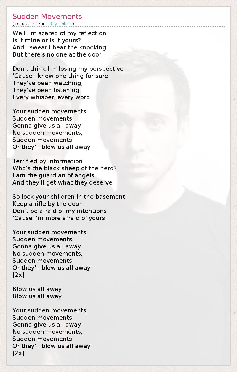 Well I'm scared of my reflection Is it mine or is it yours? And I swear I hear the knocking But there's no one at the door Don't think I'm losing my perspective 'Cause I know one thing for sure They've been watching, They've been listening Every whisper, every word Your sudden movements, Sudden movements Gonna give us all away No sudden movements, Sudden movements Or they'll blow us all away Terrified by information Who's the black sheep of the herd? I am the guardian of angels And they'll get what they deserve So lock your children in the basement Keep a rifle by the door Don't be afraid of my intentions 'Cause I'm more afraid of yours Your sudden movements, Sudden movements Gonna give us all away No sudden movements, Sudden movements Or they'll blow us all away [2x] Blow us all away Blow us all away Your sudden movements, Sudden movements Gonna give us all away No sudden movements, Sudden movements Or they'll blow us all away [2x]