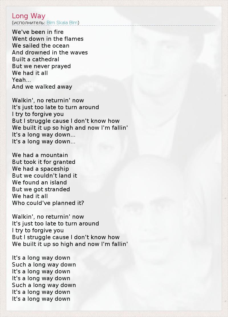 We've been in fire Went down in the flames We sailed the ocean And drowned in the waves Built a cathedral But we never prayed We had it all Yeah... And we walked away Walkin', no returnin' now It's just too late to turn around I try to forgive you But I struggle cause I don't know how We built it up so high and now I'm fallin' It's a long way down... It's a long way down... We had a mountain But took it for granted We had a spaceship But we couldn't land it We found an island But we got stranded We had it all Who could've planned it? Walkin', no returnin' now It's just too late to turn around I try to forgive you But I struggle cause I don't know how We built it up so high and now I'm fallin' It's a long way down Such a long way down It's a long way down It's a long way down Such a long way down It's a long way down It's a long way down