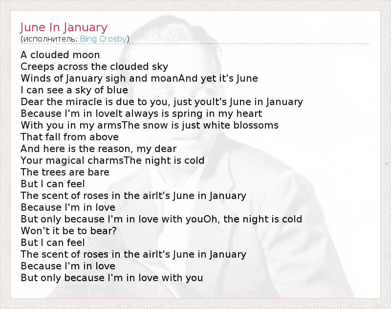 A clouded moon Creeps across the clouded sky Winds of January sigh and moanAnd yet it's June I can see a sky of blue Dear the miracle is due to you, just youIt's June in January Because I'm in loveIt always is spring in my heart With you in my armsThe snow is just white blossoms That fall from above And here is the reason, my dear Your magical charmsThe night is cold The trees are bare But I can feel The scent of roses in the airIt's June in January Because I'm in love But only because I'm in love with youOh, the night is cold Won't it be to bear? But I can feel The scent of roses in the airIt's June in January Because I'm in love But only because I'm in love with you
