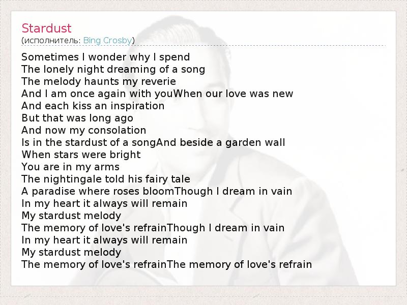 Sometimes I wonder why I spend The lonely night dreaming of a song The melody haunts my reverie And I am once again with youWhen our love was new And each kiss an inspiration But that was long ago And now my consolation Is in the stardust of a songAnd beside a garden wall When stars were bright You are in my arms The nightingale told his fairy tale A paradise where roses bloomThough I dream in vain In my heart it always will remain My stardust melody The memory of love's refrainThough I dream in vain In my heart it always will remain My stardust melody The memory of love's refrainThe memory of love's refrain