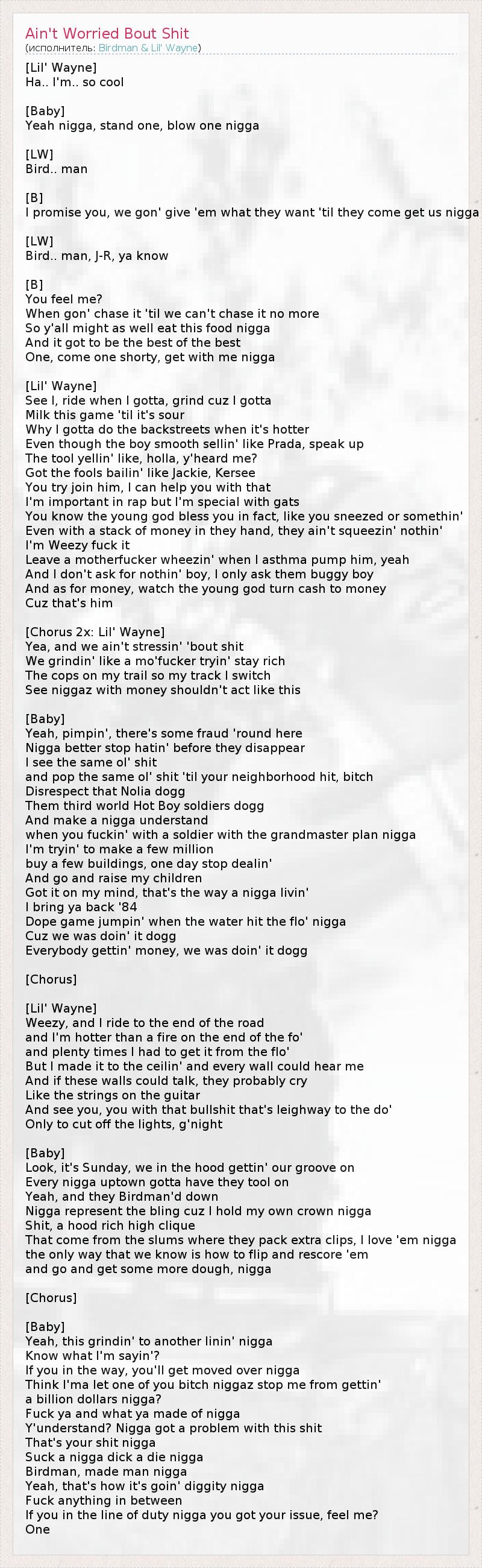 [Lil' Wayne] Ha.. I'm.. so cool [Baby] Yeah nigga, stand one, blow one nigga [LW] Bird.. man [B] I promise you, we gon' give 'em what they want 'til they come get us nigga [LW] Bird.. man, J-R, ya know [B] You feel me? When gon' chase it 'til we can't chase it no more So y'all might as well eat this food nigga And it got to be the best of the best One, come one shorty, get with me nigga [Lil' Wayne] See I, ride when I gotta, grind cuz I gotta Milk this game 'til it's sour Why I gotta do the backstreets when it's hotter Even though the boy smooth sellin' like Prada, speak up The tool yellin' like, holla, y'heard me? Got the fools bailin' like Jackie, Kersee You try join him, I can help you with that I'm important in rap but I'm special with gats You know the young god bless you in fact, like you sneezed or somethin' Even with a stack of money in they hand, they ain't squeezin' nothin' I'm Weezy fuck it Leave a motherfucker wheezin' when I asthma pump him, yeah And I don't ask for nothin' boy, I only ask them buggy boy And as for money, watch the young god turn cash to money Cuz that's him [Chorus 2x: Lil' Wayne] Yea, and we ain't stressin' 'bout shit We grindin' like a mo'fucker tryin' stay rich The cops on my trail so my track I switch See niggaz with money shouldn't act like this [Baby] Yeah, pimpin', there's some fraud 'round here Nigga better stop hatin' before they disappear I see the same ol' shit and pop the same ol' shit 'til your neighborhood hit, bitch Disrespect that Nolia dogg Them third world Hot Boy soldiers dogg And make a nigga understand when you fuckin' with a soldier with the grandmaster plan nigga I'm tryin' to make a few million buy a few buildings, one day stop dealin' And go and raise my children Got it on my mind, that's the way a nigga livin' I bring ya back '84 Dope game jumpin' when the water hit the flo' nigga Cuz we was doin' it dogg Everybody gettin' money, we was doin' it dogg [Chorus] [Lil' Wayne] Weezy, and I ride to the end of the road and I'm hotter than a fire on the end of the fo' and plenty times I had to get it from the flo' But I made it to the ceilin' and every wall could hear me And if these walls could talk, they probably cry Like the strings on the guitar And see you, you with that bullshit that's leighway to the do' Only to cut off the lights, g'night [Baby] Look, it's Sunday, we in the hood gettin' our groove on Every nigga uptown gotta have they tool on Yeah, and they Birdman'd down Nigga represent the bling cuz I hold my own crown nigga Shit, a hood rich high clique That come from the slums where they pack extra clips, I love 'em nigga the only way that we know is how to flip and rescore 'em and go and get some more dough, nigga [Chorus] [Baby] Yeah, this grindin' to another linin' nigga Know what I'm sayin'? If you in the way, you'll get moved over nigga Think I'ma let one of you bitch niggaz stop me from gettin' a billion dollars nigga? Fuck ya and what ya made of nigga Y'understand? Nigga got a problem with this shit That's your shit nigga Suck a nigga dick a die nigga Birdman, made man nigga Yeah, that's how it's goin' diggity nigga Fuck anything in between If you in the line of duty nigga you got your issue, feel me? One