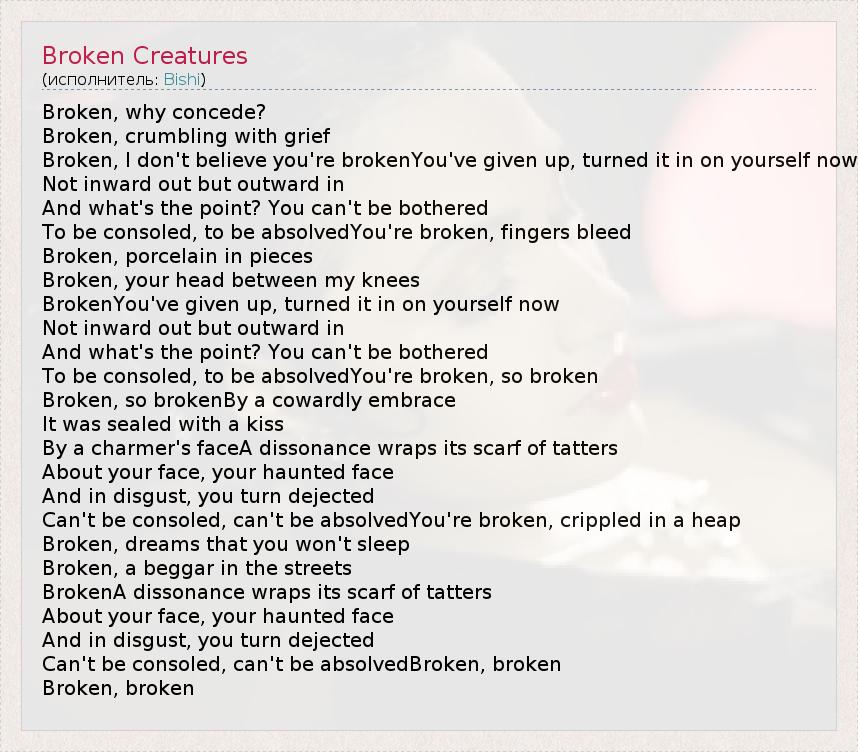 А как ты думаешь, о чем песня "Broken Creatures" ?