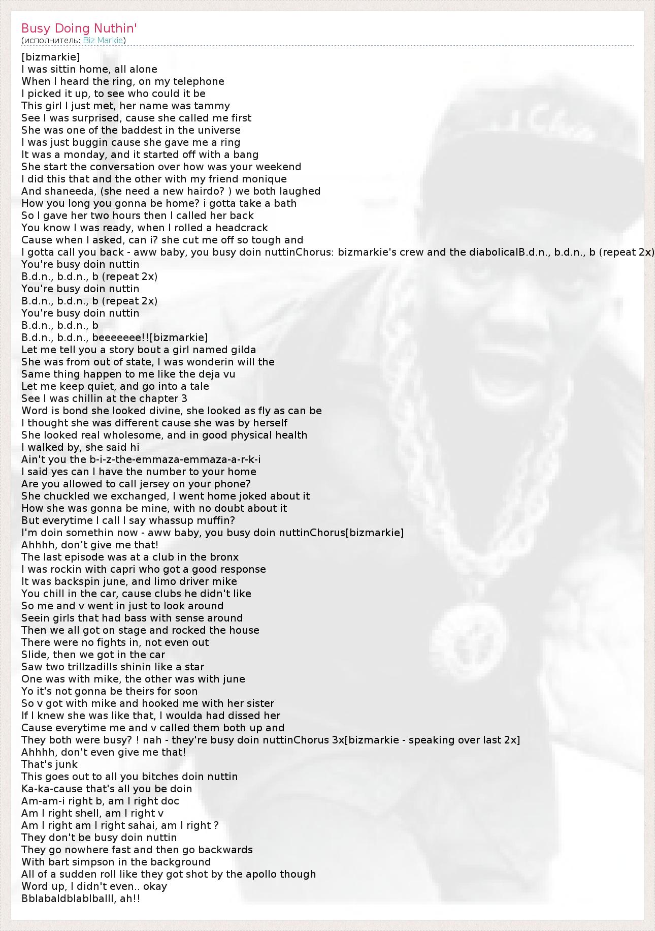 [bizmarkie] I was sittin home, all alone When I heard the ring, on my telephone I picked it up, to see who could it be This girl I just met, her name was tammy See I was surprised, cause she called me first She was one of the baddest in the universe I was just buggin cause she gave me a ring It was a monday, and it started off with a bang She start the conversation over how was your weekend I did this that and the other with my friend monique And shaneeda, (she need a new hairdo? ) we both laughed How you long you gonna be home? i gotta take a bath So I gave her two hours then I called her back You know I was ready, when I rolled a headcrack Cause when I asked, can i? she cut me off so tough and I gotta call you back - aww baby, you busy doin nuttinChorus: bizmarkie's crew and the diabolicalB.d.n., b.d.n., b (repeat 2x) You're busy doin nuttin B.d.n., b.d.n., b (repeat 2x) You're busy doin nuttin B.d.n., b.d.n., b (repeat 2x) You're busy doin nuttin B.d.n., b.d.n., b B.d.n., b.d.n., beeeeeee!![bizmarkie] Let me tell you a story bout a girl named gilda She was from out of state, I was wonderin will the Same thing happen to me like the deja vu Let me keep quiet, and go into a tale See I was chillin at the chapter 3 Word is bond she looked divine, she looked as fly as can be I thought she was different cause she was by herself She looked real wholesome, and in good physical health I walked by, she said hi Ain't you the b-i-z-the-emmaza-emmaza-a-r-k-i I said yes can I have the number to your home Are you allowed to call jersey on your phone? She chuckled we exchanged, I went home joked about it How she was gonna be mine, with no doubt about it But everytime I call I say whassup muffin? I'm doin somethin now - aww baby, you busy doin nuttinChorus[bizmarkie] Ahhhh, don't give me that! The last episode was at a club in the bronx I was rockin with capri who got a good response It was backspin june, and limo driver mike You chill in the car, cause clubs he didn't like So me and v went in just to look around Seein girls that had bass with sense around Then we all got on stage and rocked the house There were no fights in, not even out Slide, then we got in the car Saw two trillzadills shinin like a star One was with mike, the other was with june Yo it's not gonna be theirs for soon So v got with mike and hooked me with her sister If I knew she was like that, I woulda had dissed her Cause everytime me and v called them both up and They both were busy? ! nah - they're busy doin nuttinChorus 3x[bizmarkie - speaking over last 2x] Ahhhh, don't even give me that! That's junk This goes out to all you bitches doin nuttin Ka-ka-cause that's all you be doin Am-am-i right b, am I right doc Am I right shell, am I right v Am I right am I right sahai, am I right ? They don't be busy doin nuttin They go nowhere fast and then go backwards With bart simpson in the background All of a sudden roll like they got shot by the apollo though Word up, I didn't even.. okay Bblabaldblablballl, ah!!