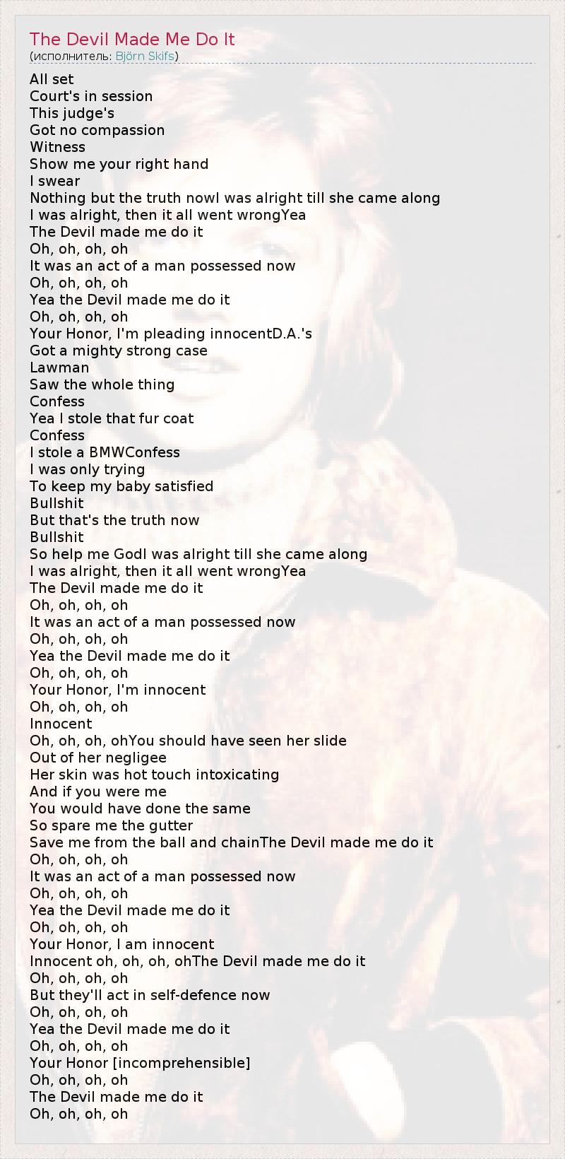 All set Court's in session This judge's Got no compassion Witness Show me your right hand I swear Nothing but the truth nowI was alright till she came along I was alright, then it all went wrongYea The Devil made me do it Oh, oh, oh, oh It was an act of a man possessed now Oh, oh, oh, oh Yea the Devil made me do it Oh, oh, oh, oh Your Honor, I'm pleading innocentD.A.'s Got a mighty strong case Lawman Saw the whole thing Confess Yea I stole that fur coat Confess I stole a BMWConfess I was only trying To keep my baby satisfied Bullshit But that's the truth now Bullshit So help me GodI was alright till she came along I was alright, then it all went wrongYea The Devil made me do it Oh, oh, oh, oh It was an act of a man possessed now Oh, oh, oh, oh Yea the Devil made me do it Oh, oh, oh, oh Your Honor, I'm innocent Oh, oh, oh, oh Innocent Oh, oh, oh, ohYou should have seen her slide Out of her negligee Her skin was hot touch intoxicating And if you were me You would have done the same So spare me the gutter Save me from the ball and chainThe Devil made me do it Oh, oh, oh, oh It was an act of a man possessed now Oh, oh, oh, oh Yea the Devil made me do it Oh, oh, oh, oh Your Honor, I am innocent Innocent oh, oh, oh, ohThe Devil made me do it Oh, oh, oh, oh But they'll act in self-defence now Oh, oh, oh, oh Yea the Devil made me do it Oh, oh, oh, oh Your Honor [incomprehensible] Oh, oh, oh, oh The Devil made me do it Oh, oh, oh, oh