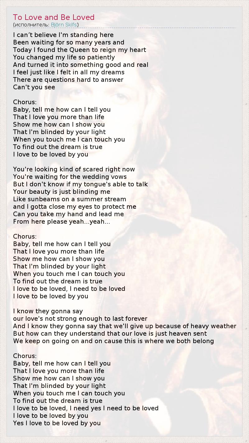 I can’t believe I'm standing here Been waiting for so many years and Today I found the Queen to reign my heart You changed my life so patiently And turned it into something good and real I feel just like I felt in all my dreams There are questions hard to answer Can't you see Chorus: Baby, tell me how can I tell you That I love you more than life Show me how can I show you That I'm blinded by your light When you touch me I can touch you To find out the dream is true I love to be loved by you You're looking kind of scared right now You're waiting for the wedding vows But I don't know if my tongue's able to talk Your beauty is just blinding me Like sunbeams on a summer stream and I gotta close my eyes to protect me Can you take my hand and lead me From here please yeah...yeah... Chorus: Baby, tell me how can I tell you That I love you more than life Show me how can I show you That I'm blinded by your light When you touch me I can touch you To find out the dream is true I love to be loved, I need to be loved I love to be loved by you I know they gonna say our love's not strong enough to last forever And I know they gonna say that we'll give up because of heavy weather But how can they understand that our love is just heaven sent We keep on going on and on cause this is where we both belong Chorus: Baby, tell me how can I tell you That I love you more than life Show me how can I show you That I'm blinded by your light When you touch me I can touch you To find out the dream is true I love to be loved, I need yes I need to be loved I love to be loved by you Yes I love to be loved by you