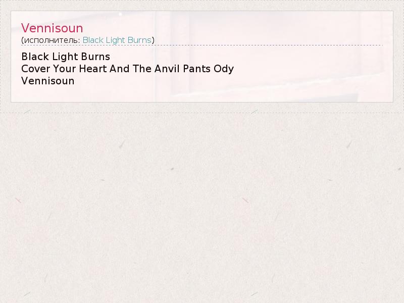 Это интересно:Black Light Burns - это проект Уэса Борланда (гитариста Limp Bizkit, гитара и вокал), в состав которого вошли также Дэнни Лонер из Nine Inch Nails (бас), Джошуа Юстис (клавишные) из Telefon Tel Aviv и Джош Фриз (ударные) из A Perfect Circle / Vandals.Летом 2007 года группа выпустила дебютный альбом Cruel Melody. Альбом был смесью индастриала... продолжение