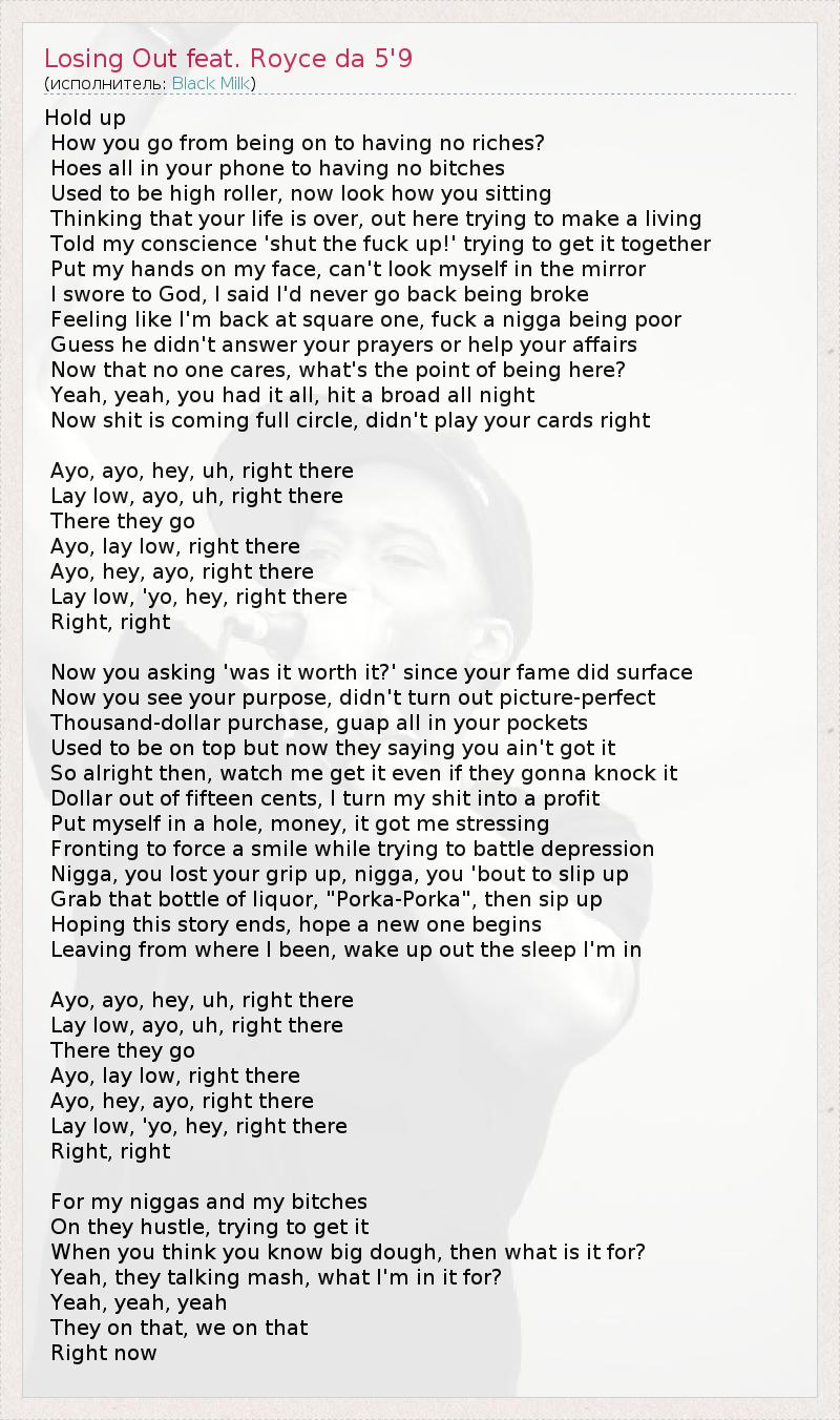 А как ты думаешь, о чем песня "Losing Out feat. Royce da 5'9" ?