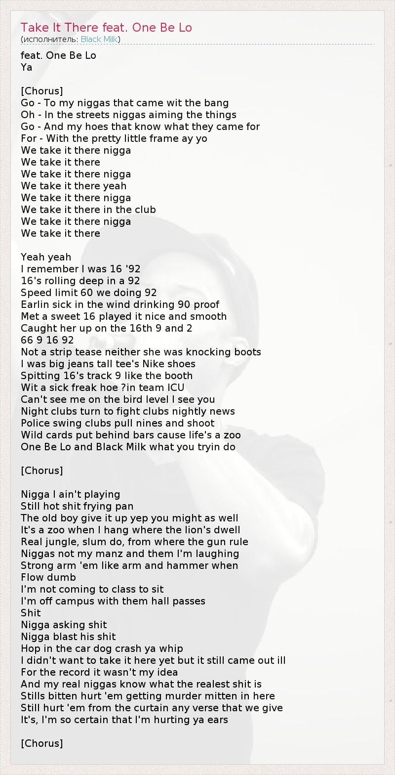 feat. One Be Lo Ya [Chorus] Go - To my niggas that came wit the bang Oh - In the streets niggas aiming the things Go - And my hoes that know what they came for For - With the pretty little frame ay yo We take it there nigga We take it there We take it there nigga We take it there yeah We take it there nigga We take it there in the club We take it there nigga We take it there Yeah yeah I remember I was 16 '92 16's rolling deep in a 92 Speed limit 60 we doing 92 Earlin sick in the wind drinking 90 proof Met a sweet 16 played it nice and smooth Caught her up on the 16th 9 and 2 66 9 16 92 Not a strip tease neither she was knocking boots I was big jeans tall tee's Nike shoes Spitting 16's track 9 like the booth Wit a sick freak hoe ?in team ICU Can't see me on the bird level I see you Night clubs turn to fight clubs nightly news Police swing clubs pull nines and shoot Wild cards put behind bars cause life's a zoo One Be Lo and Black Milk what you tryin do [Chorus] Nigga I ain't playing Still hot shit frying pan The old boy give it up yep you might as well It's a zoo when I hang where the lion's dwell Real jungle, slum do, from where the gun rule Niggas not my manz and them I'm laughing Strong arm 'em like arm and hammer when Flow dumb I'm not coming to class to sit I'm off campus with them hall passes Shit Nigga asking shit Nigga blast his shit Hop in the car dog crash ya whip I didn't want to take it here yet but it still came out ill For the record it wasn't my idea And my real niggas know what the realest shit is Stills bitten hurt 'em getting murder mitten in here Still hurt 'em from the curtain any verse that we give It's, I'm so certain that I'm hurting ya ears [Chorus]