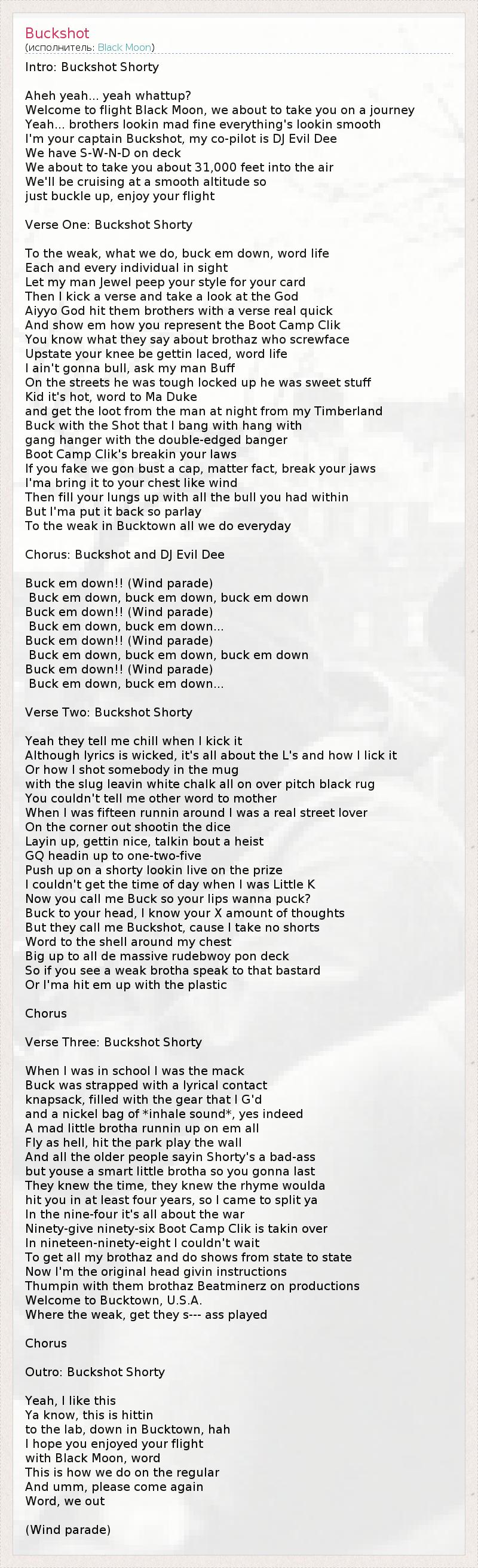 Это интересно:Рэп-коллектив Black Moon Для знакомства давайте сначала расшифруем название этого рэп-коллектива, потому что это аббревиатура. BLACK MOON = Brothers Lyrically Acting Combining Kicking Music Out On Nation. Короче, все ясно - братья-лирики тусуются и комбинируют в своей музыке так, чтобы загрузить головы всей американской нации. Кто входит в BLACK MOON. Это знаменитый MC, поэт и продюсер Buckshot Shorty (вторая часть вскоре сама собой... продолжение