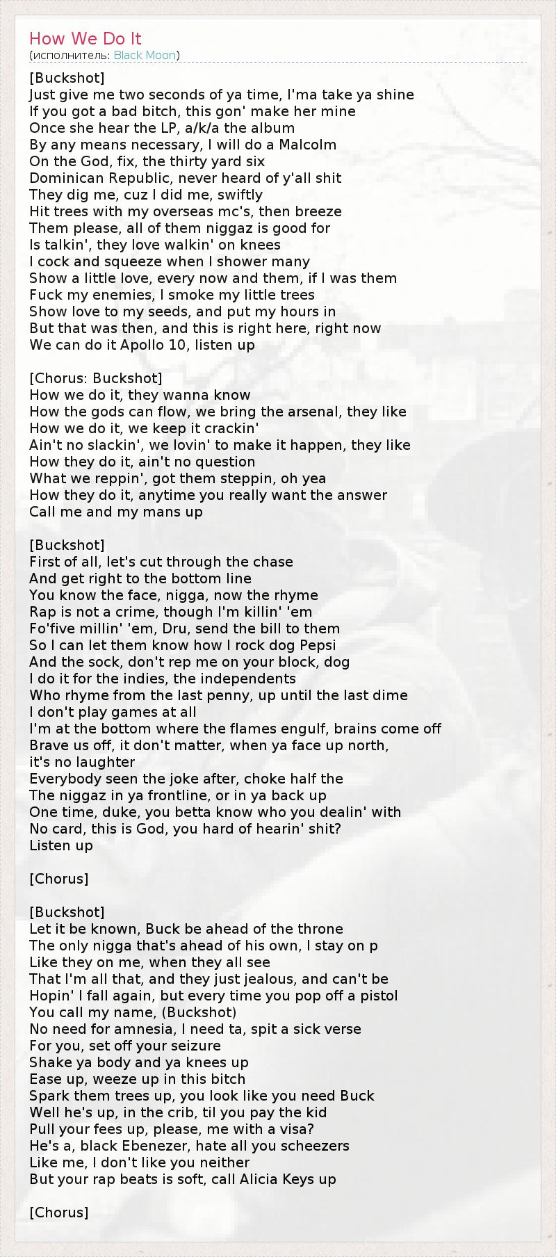 Это интересно:Рэп-коллектив Black Moon Для знакомства давайте сначала расшифруем название этого рэп-коллектива, потому что это аббревиатура. BLACK MOON = Brothers Lyrically Acting Combining Kicking Music Out On Nation. Короче, все ясно - братья-лирики тусуются и комбинируют в своей музыке так, чтобы загрузить головы всей американской нации. Кто входит в BLACK MOON. Это знаменитый MC, поэт и продюсер Buckshot Shorty (вторая часть вскоре сама собой... продолжение