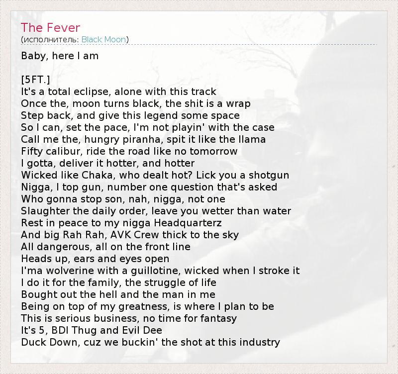 Это интересно:Рэп-коллектив Black Moon Для знакомства давайте сначала расшифруем название этого рэп-коллектива, потому что это аббревиатура. BLACK MOON = Brothers Lyrically Acting Combining Kicking Music Out On Nation. Короче, все ясно - братья-лирики тусуются и комбинируют в своей музыке так, чтобы загрузить головы всей американской нации. Кто входит в BLACK MOON. Это знаменитый MC, поэт и продюсер Buckshot Shorty (вторая часть вскоре сама собой... продолжение