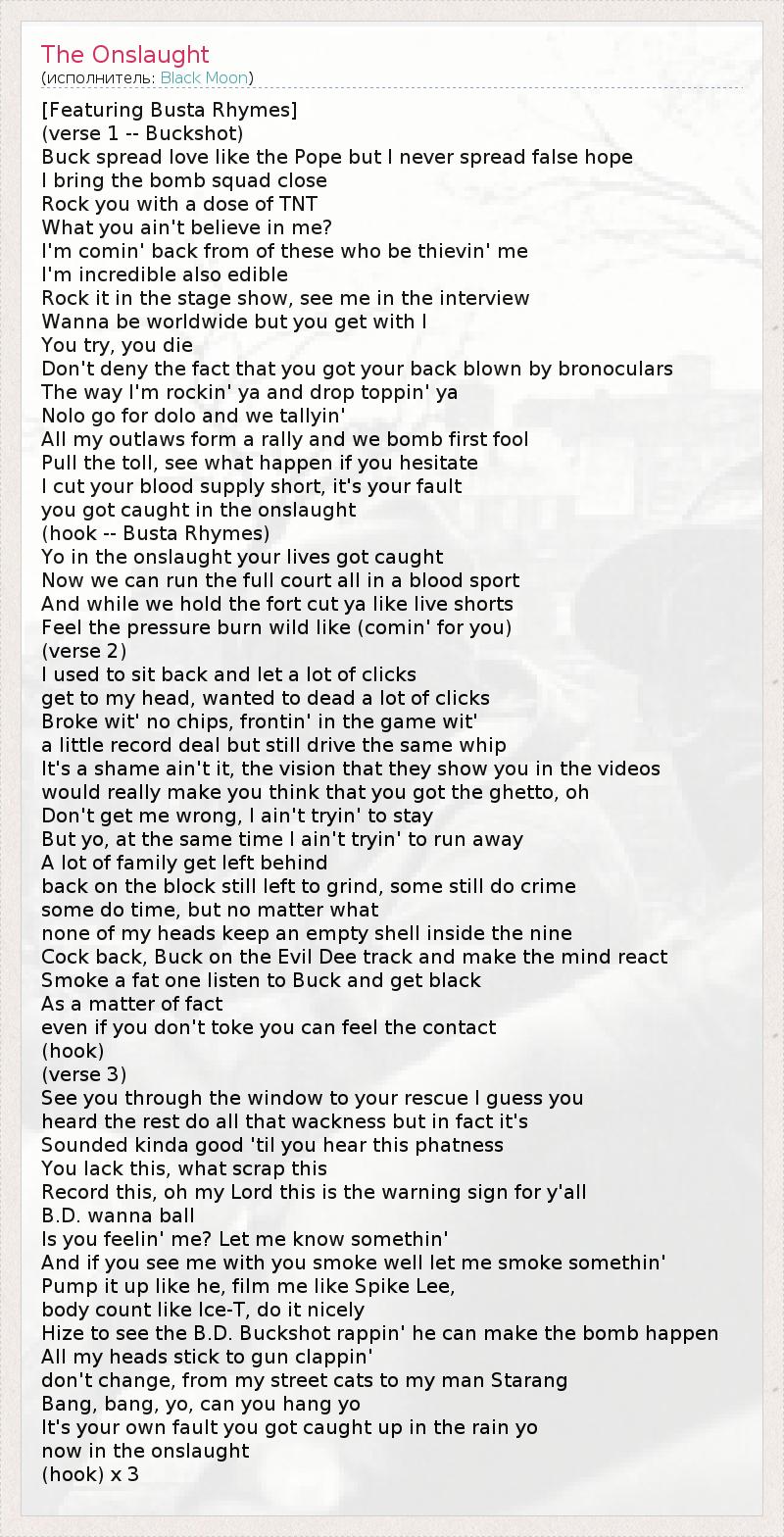 Это интересно:Рэп-коллектив Black Moon Для знакомства давайте сначала расшифруем название этого рэп-коллектива, потому что это аббревиатура. BLACK MOON = Brothers Lyrically Acting Combining Kicking Music Out On Nation. Короче, все ясно - братья-лирики тусуются и комбинируют в своей музыке так, чтобы загрузить головы всей американской нации. Кто входит в BLACK MOON. Это знаменитый MC, поэт и продюсер Buckshot Shorty (вторая часть вскоре сама собой... продолжение