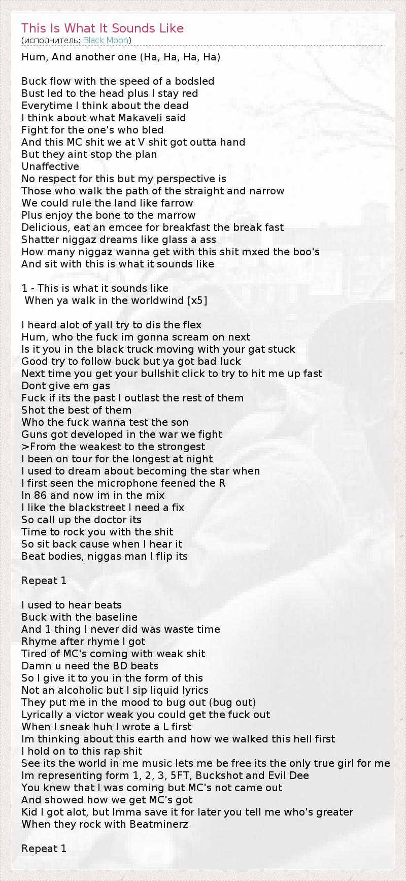 Hum, And another one (Ha, Ha, Ha, Ha) Buck flow with the speed of a bodsled Bust led to the head plus I stay red Everytime I think about the dead I think about what Makaveli said Fight for the one's who bled And this MC shit we at V shit got outta hand But they aint stop the plan Unaffective No respect for this but my perspective is Those who walk the path of the straight and narrow We could rule the land like farrow Plus enjoy the bone to the marrow Delicious, eat an emcee for breakfast the break fast Shatter niggaz dreams like glass a ass How many niggaz wanna get with this shit mxed the boo's And sit with this is what it sounds like 1 - This is what it sounds like When ya walk in the worldwind [x5] I heard alot of yall try to dis the flex Hum, who the fuck im gonna scream on next Is it you in the black truck moving with your gat stuck Good try to follow buck but ya got bad luck Next time you get your bullshit click to try to hit me up fast Dont give em gas Fuck if its the past I outlast the rest of them Shot the best of them Who the fuck wanna test the son Guns got developed in the war we fight >From the weakest to the strongest I been on tour for the longest at night I used to dream about becoming the star when I first seen the microphone feened the R In 86 and now im in the mix I like the blackstreet I need a fix So call up the doctor its Time to rock you with the shit So sit back cause when I hear it Beat bodies, niggas man I flip its Repeat 1 I used to hear beats Buck with the baseline And 1 thing I never did was waste time Rhyme after rhyme I got Tired of MC's coming with weak shit Damn u need the BD beats So I give it to you in the form of this Not an alcoholic but I sip liquid lyrics They put me in the mood to bug out (bug out) Lyrically a victor weak you could get the fuck out When I sneak huh I wrote a L first Im thinking about this earth and how we walked this hell first I hold on to this rap shit See its the world in me music lets me be free its the only true girl for me Im representing form 1, 2, 3, 5FT, Buckshot and Evil Dee You knew that I was coming but MC's not came out And showed how we get MC's got Kid I got alot, but Imma save it for later you tell me who's greater When they rock with Beatminerz Repeat 1
