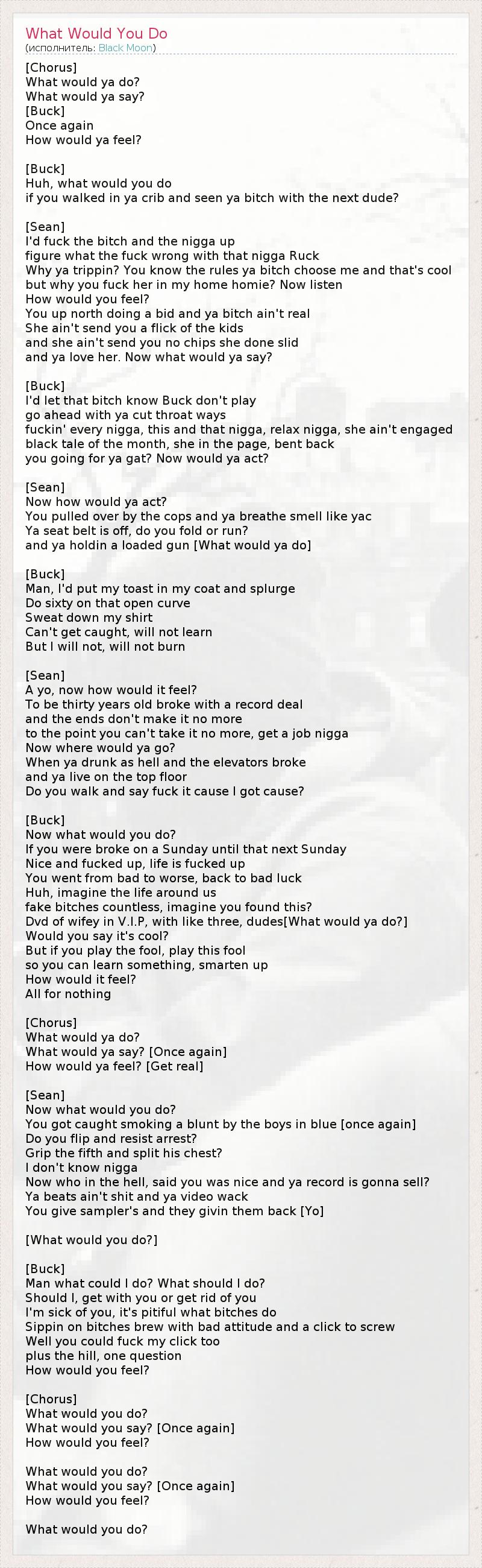 [Chorus] What would ya do? What would ya say? [Buck] Once again How would ya feel? [Buck] Huh, what would you do if you walked in ya crib and seen ya bitch with the next dude? [Sean] I'd fuck the bitch and the nigga up figure what the fuck wrong with that nigga Ruck Why ya trippin? You know the rules ya bitch choose me and that's cool but why you fuck her in my home homie? Now listen How would you feel? You up north doing a bid and ya bitch ain't real She ain't send you a flick of the kids and she ain't send you no chips she done slid and ya love her. Now what would ya say? [Buck] I'd let that bitch know Buck don't play go ahead with ya cut throat ways fuckin' every nigga, this and that nigga, relax nigga, she ain't engaged black tale of the month, she in the page, bent back you going for ya gat? Now would ya act? [Sean] Now how would ya act? You pulled over by the cops and ya breathe smell like yac Ya seat belt is off, do you fold or run? and ya holdin a loaded gun [What would ya do] [Buck] Man, I'd put my toast in my coat and splurge Do sixty on that open curve Sweat down my shirt Can't get caught, will not learn But I will not, will not burn [Sean] A yo, now how would it feel? To be thirty years old broke with a record deal and the ends don't make it no more to the point you can't take it no more, get a job nigga Now where would ya go? When ya drunk as hell and the elevators broke and ya live on the top floor Do you walk and say fuck it cause I got cause? [Buck] Now what would you do? If you were broke on a Sunday until that next Sunday Nice and fucked up, life is fucked up You went from bad to worse, back to bad luck Huh, imagine the life around us fake bitches countless, imagine you found this? Dvd of wifey in V.I.P, with like three, dudes[What would ya do?] Would you say it's cool? But if you play the fool, play this fool so you can learn something, smarten up How would it feel? All for nothing [Chorus] What would ya do? What would ya say? [Once again] How would ya feel? [Get real] [Sean] Now what would you do? You got caught smoking a blunt by the boys in blue [once again] Do you flip and resist arrest? Grip the fifth and split his chest? I don't know nigga Now who in the hell, said you was nice and ya record is gonna sell? Ya beats ain't shit and ya video wack You give sampler's and they givin them back [Yo] [What would you do?] [Buck] Man what could I do? What should I do? Should I, get with you or get rid of you I'm sick of you, it's pitiful what bitches do Sippin on bitches brew with bad attitude and a click to screw Well you could fuck my click too plus the hill, one question How would you feel? [Chorus] What would you do? What would you say? [Once again] How would you feel? What would you do? What would you say? [Once again] How would you feel? What would you do?