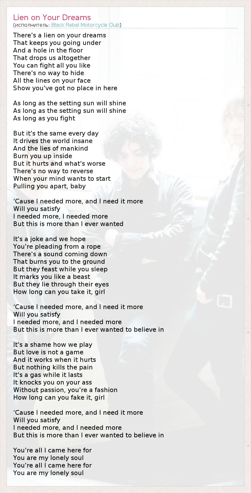 Ты сдала свои мечты в залог, И теперь он тянет тебя вниз, А в полу дыра, Которая затягивает нас. Ты можешь бороться, сколько хочешь, Прятаться бесполезно: Все морщины на твоем лице Говорят, что здесь тебе нет места. До тех пор, пока заходящее солнце светит, До тех пор, пока заходящее солнце светит, До тех пор, пока ты сражаешься. Но каждый день одно и то же, Это сводит мир с ума, И ложь человечества Сжигает тебя изнутри. Это больно, и, что еще хуже, Нельзя обернуть всё вспять, Когда твой разум начинает Разрывать тебя на части, детка. Потому что мне нужно было еще, мне нужно еще, Ты сделаешь? Мне нужно было еще, мне нужно было еще. Но это больше, чем я когда-либо хотел. Это шутка, и мы надеемся. Ты умоляешь, вися на веревке. Доносится звук, Который сжигает тебя дотла. Но они пируют, пока ты спишь. На тебе клеймо, как на звере. Но они лгут, это видно по глазам, Сколько ты можешь это терпеть, девочка? Потому что мне нужно было еще, мне нужно еще, Ты сделаешь? Мне нужно было еще, мне нужно было еще. Но это большее, во что я когда-либо хотел верить. Это позор - то, как мы играем, Но любовь не игра. И она живет, пока нам больно, Но нечем унять боль. Она как газ, пока ты им дышишь, Тебя штырит. Без страсти это просто мода. Сколько ты можешь притворяться, девочка? Потому что мне нужно было еще, мне нужно еще, Ты сделаешь? Мне нужно было еще, мне нужно было еще. Но это большее, во что я когда-либо хотел верить. Ты все, ради чего я сюда пришел. Ты моя одинокая душа. Ты все, ради чего я сюда пришел. Ты моя одинокая душа.