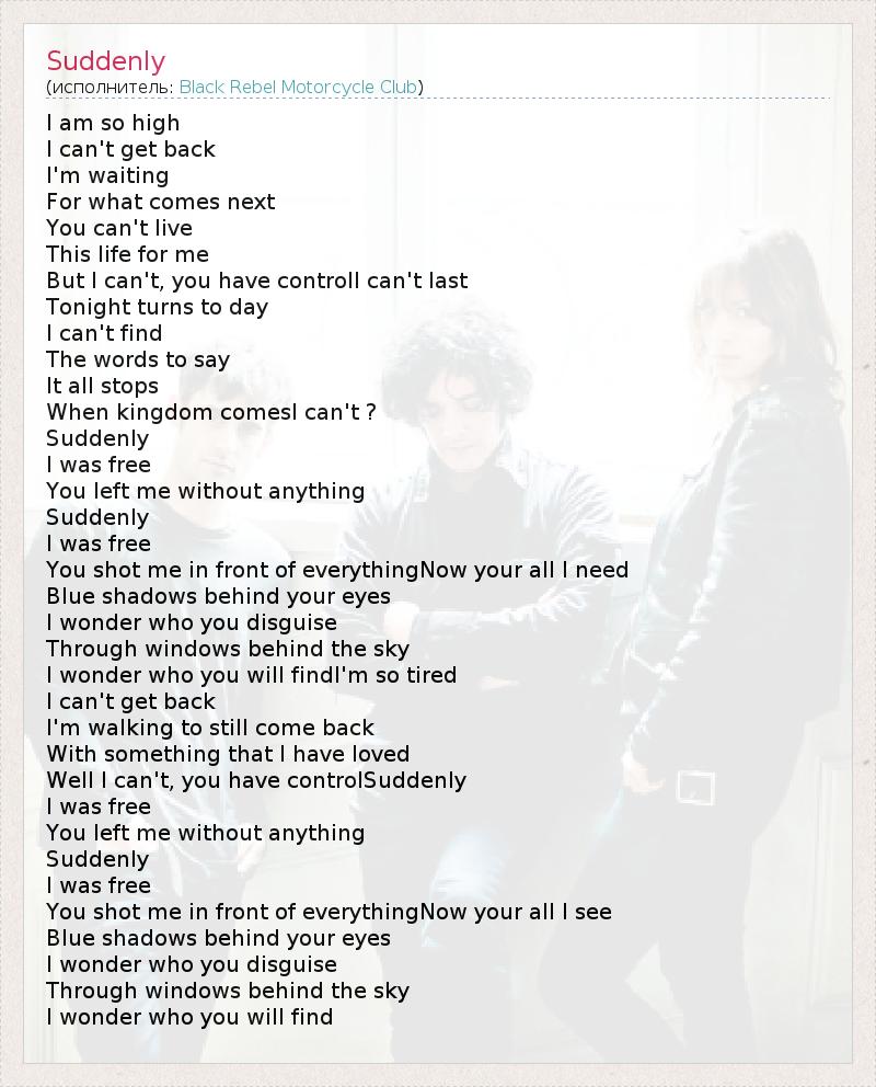 I am so high I can't get back I'm waiting For what comes next You can't live This life for me But I can't, you have controlI can't last Tonight turns to day I can't find The words to say It all stops When kingdom comesI can't ? Suddenly I was free You left me without anything Suddenly I was free You shot me in front of everythingNow your all I need Blue shadows behind your eyes I wonder who you disguise Through windows behind the sky I wonder who you will findI'm so tired I can't get back I'm walking to still come back With something that I have loved Well I can't, you have controlSuddenly I was free You left me without anything Suddenly I was free You shot me in front of everythingNow your all I see Blue shadows behind your eyes I wonder who you disguise Through windows behind the sky I wonder who you will find