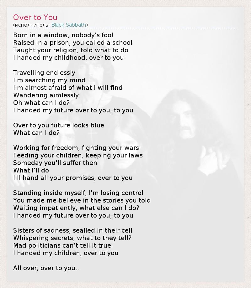 Born in a window, nobody's fool Raised in a prison, you called a school Taught your religion, told what to do I handed my childhood, over to you Travelling endlessly I'm searching my mind I'm almost afraid of what I will find Wandering aimlessly Oh what can I do? I handed my future over to you, to you Over to you future looks blue What can I do? Working for freedom, fighting your wars Feeding your children, keeping your laws Someday you'll suffer then What I'll do I'll hand all your promises, over to you Standing inside myself, I'm losing control You made me believe in the stories you told Waiting impatiently, what else can I do? I handed my future over to you, to you Sisters of sadness, sealled in their cell Whispering secrets, what to they tell? Mad politicians can't tell it true I handed my children, over to you All over, over to you...