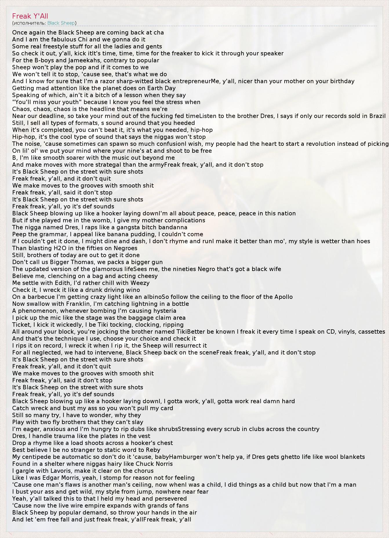 Once again the Black Sheep are coming back at cha And I am the fabulous Chi and we gonna do it Some real freestyle stuff for all the ladies and gents So check it out, y'all, kick itIt's time, time, time for the freaker to kick it through your speaker For the B-boys and Jameekahs, contrary to popular Sheep won't play the pop and if it comes to we We won't tell it to stop, 'cause see, that's what we do And I know for sure that I'm a razor sharp-witted black entrepreneurMe, y'all, nicer than your mother on your birthday Getting mad attention like the planet does on Earth Day Speaking of which, ain't it a bitch of a lesson when they say "You'll miss your youth" because I know you feel the stress when Chaos, chaos, chaos is the headline that means we're Near our deadline, so take your mind out of the fucking fed timeListen to the brother Dres, I says if only our records sold in Brazil Still, I sell all types of formats, s sound around that you heeded When it's completed, you can't beat it, it's what you needed, hip-hop Hip-hop, it's the cool type of sound that says the niggas won't stop The noise, 'cause sometimes can spawn so much confusionI wish, my people had the heart to start a revolution instead of picking On lil' ol' we put your mind where your nine's at and shoot to be free B, I'm like smooth soarer with the music out beyond me And make moves with more strategal than the armyFreak freak, y'all, and it don't stop It's Black Sheep on the street with sure shots Freak freak, y'all, and it don't quit We make moves to the grooves with smooth shit Freak freak, y'all, said it don't stop It's Black Sheep on the street with sure shots Freak freak, y'all, yo it's def sounds Black Sheep blowing up like a hooker laying downI'm all about peace, peace, peace in this nation But if she played me in the womb, I give my mother complications The nigga named Dres, I raps like a gangsta bitch bandanna Peep the grammar, I appeal like banana pudding, I couldn't come If I couldn't get it done, I might dine and dash, I don't rhyme and runI make it better than mo', my style is wetter than hoes Than blasting H2O in the fifties on Negroes Still, brothers of today are out to get it done Don't call us Bigger Thomas, we packs a bigger gun The updated version of the glamorous lifeSees me, the nineties Negro that's got a black wife Believe me, clenching on a bag and acting cheesy Me settle with Edith, I'd rather chill with Weezy Check it, I wreck it like a drunk driving wino On a barbecue I'm getting crazy light like an albinoSo follow the ceiling to the floor of the Apollo Now swallow with Franklin, I'm catching lightning in a bottle A phenomenon, whenever bombing I'm causing hysteria I pick up the mic like the stage was the baggage claim area Ticket, I kick it wickedly, I be Tiki tocking, clocking, ripping All around your block, you're jocking the brother named TikiBetter be known I freak it every time I speak on CD, vinyls, cassettes And that's the technique I use, choose your choice and check it I rips it on record, I wreck it when I rip it, the Sheep will resurrect it For all neglected, we had to intervene, Black Sheep back on the sceneFreak freak, y'all, and it don't stop It's Black Sheep on the street with sure shots Freak freak, y'all, and it don't quit We make moves to the grooves with smooth shit Freak freak, y'all, said it don't stop It's Black Sheep on the street with sure shots Freak freak, y'all, yo it's def sounds Black Sheep blowing up like a hooker laying downI, I gotta work, y'all, gotta work real damn hard Catch wreck and bust my ass so you won't pull my card Still so many try, I have to wonder, why they Play with two fly brothers that they can't slay I'm eager, anxious and I'm hungry to rip dubs like shrubsStressing every scrub in clubs across the country Dres, I handle trauma like the plates in the vest Drop a rhyme like a load shoots across a hooker's chest Best believe I be no stranger to static word to Reby My centipede be automatic so don't do it 'cause, babyHamburger won't help ya, if Dres gets ghetto life like wool blankets Found in a shelter where niggas hairy like Chuck Norris I gargle with Lavoris, make it clear on the chorus Like I was Edgar Morris, yeah, I stomp for reason not for feeling 'Cause one man's flaws is another man's ceiling, now whenI was a child, I did things as a child but now that I'm a man I bust your ass and get wild, my style from jump, nowhere near fear Yeah, y'all talked this to that I held my head and persevered 'Cause now the live wire empire expands with grands of fans Black Sheep by popular demand, so throw your hands in the air And let 'em free fall and just freak freak, y'allFreak freak, y'all
