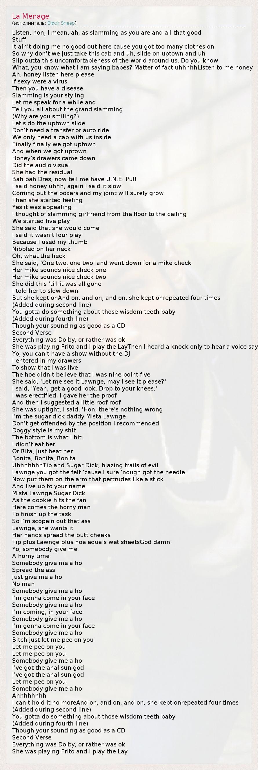 Это интересно:Black Sheep is a hip hop duo from Queens, New York, composed of Andres "Dres" Titus and William "Mista Lawnge" McLean. The duo is from New York but met as teenagers in North Carolina, where both of their families relocated. The group was an affiliate of the Native Tongues, which included the Jungle Brothers, A Tribe Called Quest, and De La Soul. After getting together in 1989, Black Sheep debuted in 1991 with the hit song "Flavor of the Month" and later released its first album, A Wolf in Sheep's Clothing, which gained them praise and recognition in the hip-hop community for the album's unique rhythms and intelligent lyrics. After six years together, Black Sheep... продолжение