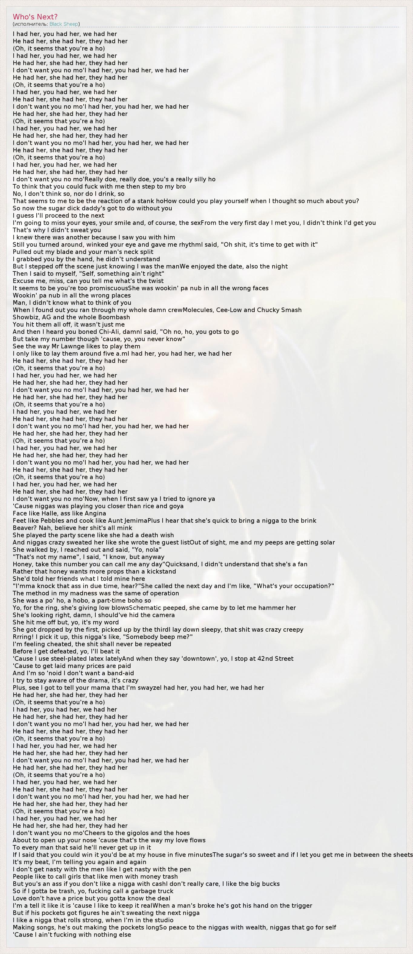 I had her, you had her, we had her He had her, she had her, they had her (Oh, it seems that you're a ho) I had her, you had her, we had her He had her, she had her, they had her I don't want you no mo'I had her, you had her, we had her He had her, she had her, they had her (Oh, it seems that you're a ho) I had her, you had her, we had her He had her, she had her, they had her I don't want you no mo'I had her, you had her, we had her He had her, she had her, they had her (Oh, it seems that you're a ho) I had her, you had her, we had her He had her, she had her, they had her I don't want you no mo'I had her, you had her, we had her He had her, she had her, they had her (Oh, it seems that you're a ho) I had her, you had her, we had her He had her, she had her, they had her I don't want you no mo'Really doe, really doe, you's a really silly ho To think that you could fuck with me then step to my bro No, I don't think so, nor do I drink, so That seems to me to be the reaction of a stank hoHow could you play yourself when I thought so much about you? So now the sugar dick daddy's got to do without you I guess I'll proceed to the next I'm going to miss your eyes, your smile and, of course, the sexFrom the very first day I met you, I didn't think I'd get you That's why I didn't sweat you I knew there was another because I saw you with him Still you turned around, winked your eye and gave me rhythmI said, "Oh shit, it's time to get with it" Pulled out my blade and your man's neck split I grabbed you by the hand, he didn't understand But I stepped off the scene just knowing I was the manWe enjoyed the date, also the night Then I said to myself, "Self, something ain't right" Excuse me, miss, can you tell me what's the twist It seems to be you're too promiscuousShe was wookin' pa nub in all the wrong faces Wookin' pa nub in all the wrong places Man, I didn't know what to think of you When I found out you ran through my whole damn crewMolecules, Cee-Low and Chucky Smash Showbiz, AG and the whole Boombash You hit them all off, it wasn't just me And then I heard you boned Chi-Ali, damnI said, "Oh no, ho, you gots to go But take my number though 'cause, yo, you never know" See the way Mr Lawnge likes to play them I only like to lay them around five a.mI had her, you had her, we had her He had her, she had her, they had her (Oh, it seems that you're a ho) I had her, you had her, we had her He had her, she had her, they had her I don't want you no mo'I had her, you had her, we had her He had her, she had her, they had her (Oh, it seems that you're a ho) I had her, you had her, we had her He had her, she had her, they had her I don't want you no mo'I had her, you had her, we had her He had her, she had her, they had her (Oh, it seems that you're a ho) I had her, you had her, we had her He had her, she had her, they had her I don't want you no mo'I had her, you had her, we had her He had her, she had her, they had her (Oh, it seems that you're a ho) I had her, you had her, we had her He had her, she had her, they had her I don't want you no mo'Now, when I first saw ya I tried to ignore ya 'Cause niggas was playing you closer than rice and goya Face like Halle, ass like Angina Feet like Pebbles and cook like Aunt JemimaPlus I hear that she's quick to bring a nigga to the brink Beaver? Nah, believe her shit's all mink She played the party scene like she had a death wish And niggas crazy sweated her like she wrote the guest listOut of sight, me and my peeps are getting solar She walked by, I reached out and said, "Yo, nola" "That's not my name", I said, "I know, but anyway Honey, take this number you can call me any day"Quicksand, I didn't understand that she's a fan Rather that honey wants more props than a kickstand She'd told her friends what I told mine here "I'mma knock that ass in due time, hear?"She called the next day and I'm like, "What's your occupation?" The method in my madness was the same of operation She was a po' ho, a hobo, a part-time boho so Yo, for the ring, she's giving low blowsSchematic peeped, she came by to let me hammer her She's looking right, damn, I should've hid the camera She hit me off but, yo, it's my word She got dropped by the first, picked up by the thirdI lay down sleepy, that shit was crazy creepy Rrring! I pick it up, this nigga's like, "Somebody beep me?" I'm feeling cheated, the shit shall never be repeated Before I get defeated, yo, I'll beat it 'Cause I use steel-plated latex latelyAnd when they say 'downtown', yo, I stop at 42nd Street 'Cause to get laid many prices are paid And I'm so 'noid I don't want a band-aid I try to stay aware of the drama, it's crazy Plus, see I got to tell your mama that I'm swayzeI had her, you had her, we had her He had her, she had her, they had her (Oh, it seems that you're a ho) I had her, you had her, we had her He had her, she had her, they had her I don't want you no mo'I had her, you had her, we had her He had her, she had her, they had her (Oh, it seems that you're a ho) I had her, you had her, we had her He had her, she had her, they had her I don't want you no mo'I had her, you had her, we had her He had her, she had her, they had her (Oh, it seems that you're a ho) I had her, you had her, we had her He had her, she had her, they had her I don't want you no mo'I had her, you had her, we had her He had her, she had her, they had her (Oh, it seems that you're a ho) I had her, you had her, we had her He had her, she had her, they had her I don't want you no mo'Cheers to the gigolos and the hoes About to open up your nose 'cause that's the way my love flows To every man that said he'll never get up in it If I said that you could win it you'd be at my house in five minutesThe sugar's so sweet and if I let you get me in between the sheets It's my beat, I'm telling you again and again I don't get nasty with the men like I get nasty with the pen People like to call girls that like men with money trash But you's an ass if you don't like 