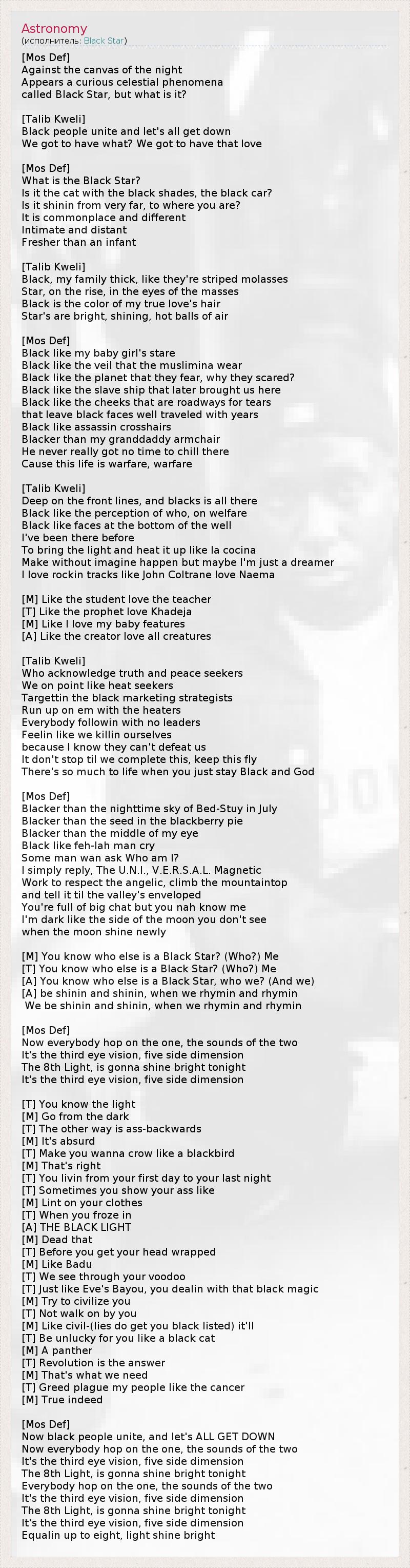 Это интересно:Подписавшись на Rawkus Records со своим школьным другом Talib Kweli, Mos Def создал группу Black Star, и в 1998 они выпустили альбом с незамысловатым названием "Mos Def and Talib Kweli are Black Star". Большинство трэков для них спродюсировал Hi-Tek. В то время на пике популярности был гангстерский рэп, весь мир обсуждал убийства 2Pac'a и The... продолжение