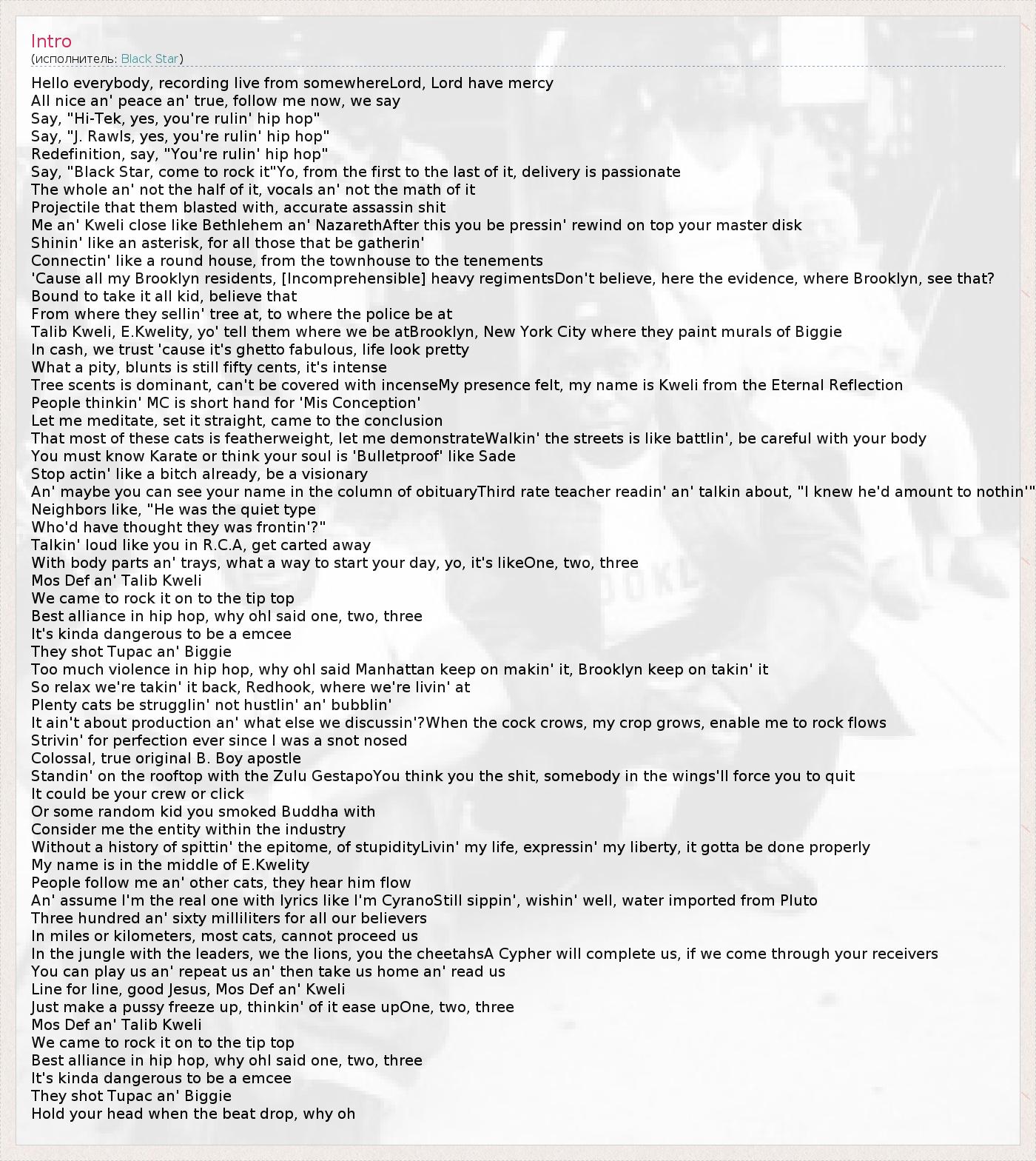 Это интересно:Подписавшись на Rawkus Records со своим школьным другом Talib Kweli, Mos Def создал группу Black Star, и в 1998 они выпустили альбом с незамысловатым названием "Mos Def and Talib Kweli are Black Star". Большинство трэков для них спродюсировал Hi-Tek. В то время на пике популярности был гангстерский рэп, весь мир обсуждал убийства 2Pac'a и The... продолжение
