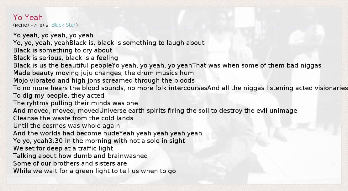 Это интересно:Подписавшись на Rawkus Records со своим школьным другом Talib Kweli, Mos Def создал группу Black Star, и в 1998 они выпустили альбом с незамысловатым названием "Mos Def and Talib Kweli are Black Star". Большинство трэков для них спродюсировал Hi-Tek. В то время на пике популярности был гангстерский рэп, весь мир обсуждал убийства 2Pac'a и The... продолжение