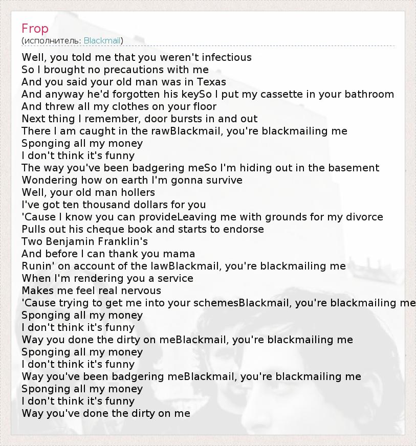 Well, you told me that you weren't infectious So I brought no precautions with me And you said your old man was in Texas And anyway he'd forgotten his keySo I put my cassette in your bathroom And threw all my clothes on your floor Next thing I remember, door bursts in and out There I am caught in the rawBlackmail, you're blackmailing me Sponging all my money I don't think it's funny The way you've been badgering meSo I'm hiding out in the basement Wondering how on earth I'm gonna survive Well, your old man hollers I've got ten thousand dollars for you 'Cause I know you can provideLeaving me with grounds for my divorce Pulls out his cheque book and starts to endorse Two Benjamin Franklin's And before I can thank you mama Runin' on account of the lawBlackmail, you're blackmailing me When I'm rendering you a service Makes me feel real nervous 'Cause trying to get me into your schemesBlackmail, you're blackmailing me Sponging all my money I don't think it's funny Way you done the dirty on meBlackmail, you're blackmailing me Sponging all my money I don't think it's funny Way you've been badgering meBlackmail, you're blackmailing me Sponging all my money I don't think it's funny Way you've done the dirty on me