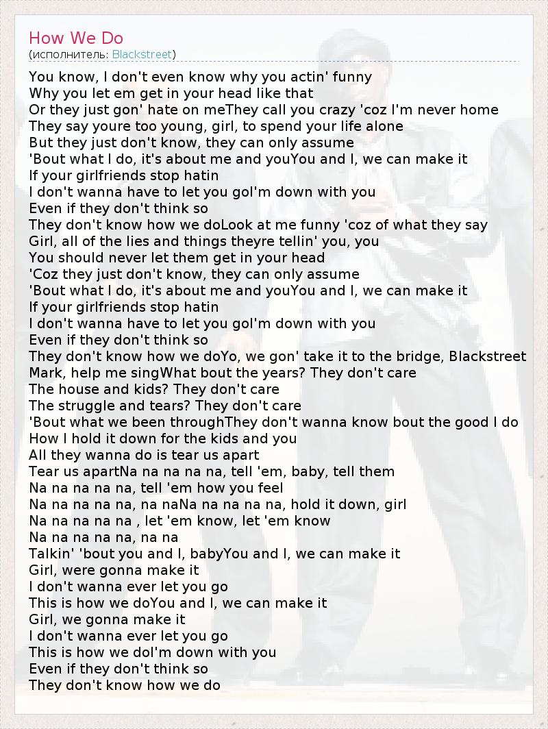 You know, I don't even know why you actin' funny Why you let em get in your head like that Or they just gon' hate on meThey call you crazy 'coz I'm never home They say youre too young, girl, to spend your life alone But they just don't know, they can only assume 'Bout what I do, it's about me and youYou and I, we can make it If your girlfriends stop hatin I don't wanna have to let you goI'm down with you Even if they don't think so They don't know how we doLook at me funny 'coz of what they say Girl, all of the lies and things theyre tellin' you, you You should never let them get in your head 'Coz they just don't know, they can only assume 'Bout what I do, it's about me and youYou and I, we can make it If your girlfriends stop hatin I don't wanna have to let you goI'm down with you Even if they don't think so They don't know how we doYo, we gon' take it to the bridge, Blackstreet Mark, help me singWhat bout the years? They don't care The house and kids? They don't care The struggle and tears? They don't care 'Bout what we been throughThey don't wanna know bout the good I do How I hold it down for the kids and you All they wanna do is tear us apart Tear us apartNa na na na na, tell 'em, baby, tell them Na na na na na, tell 'em how you feel Na na na na na, na naNa na na na na, hold it down, girl Na na na na na , let 'em know, let 'em know Na na na na na, na na Talkin' 'bout you and I, babyYou and I, we can make it Girl, were gonna make it I don't wanna ever let you go This is how we doYou and I, we can make it Girl, we gonna make it I don't wanna ever let you go This is how we doI'm down with you Even if they don't think so They don't know how we do